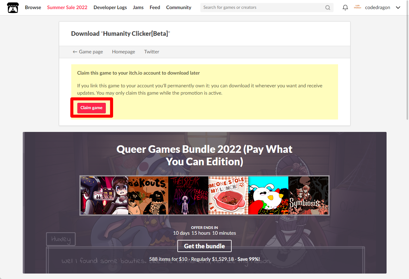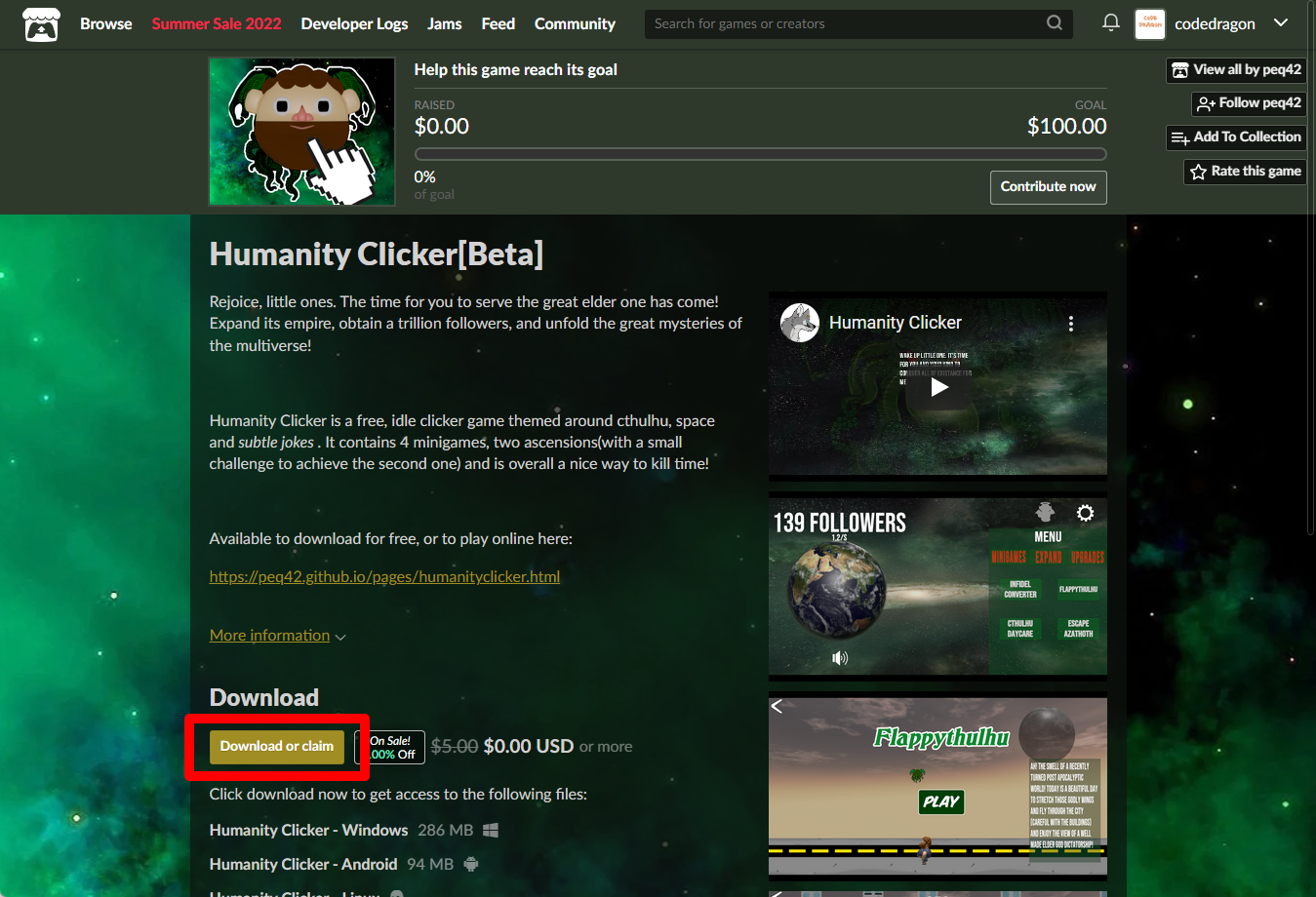 "Humanity Clicker[Beta]" 페이지에 있는 [Download or claim]을 클릭합니다.