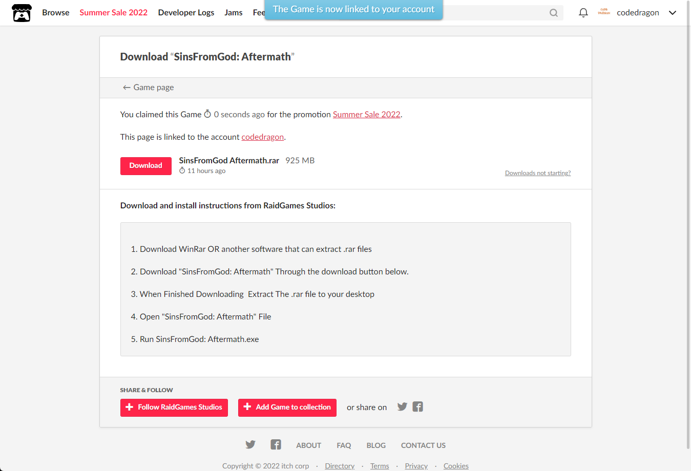[Claim game]을 클릭하면 "SinsFromGod: Aftermath" 게임이 나의 게임 라이브러리에 추가되고 설치파일을 다운받을 수 있는 페이지로 이동됩니다.