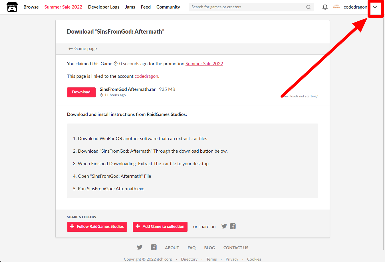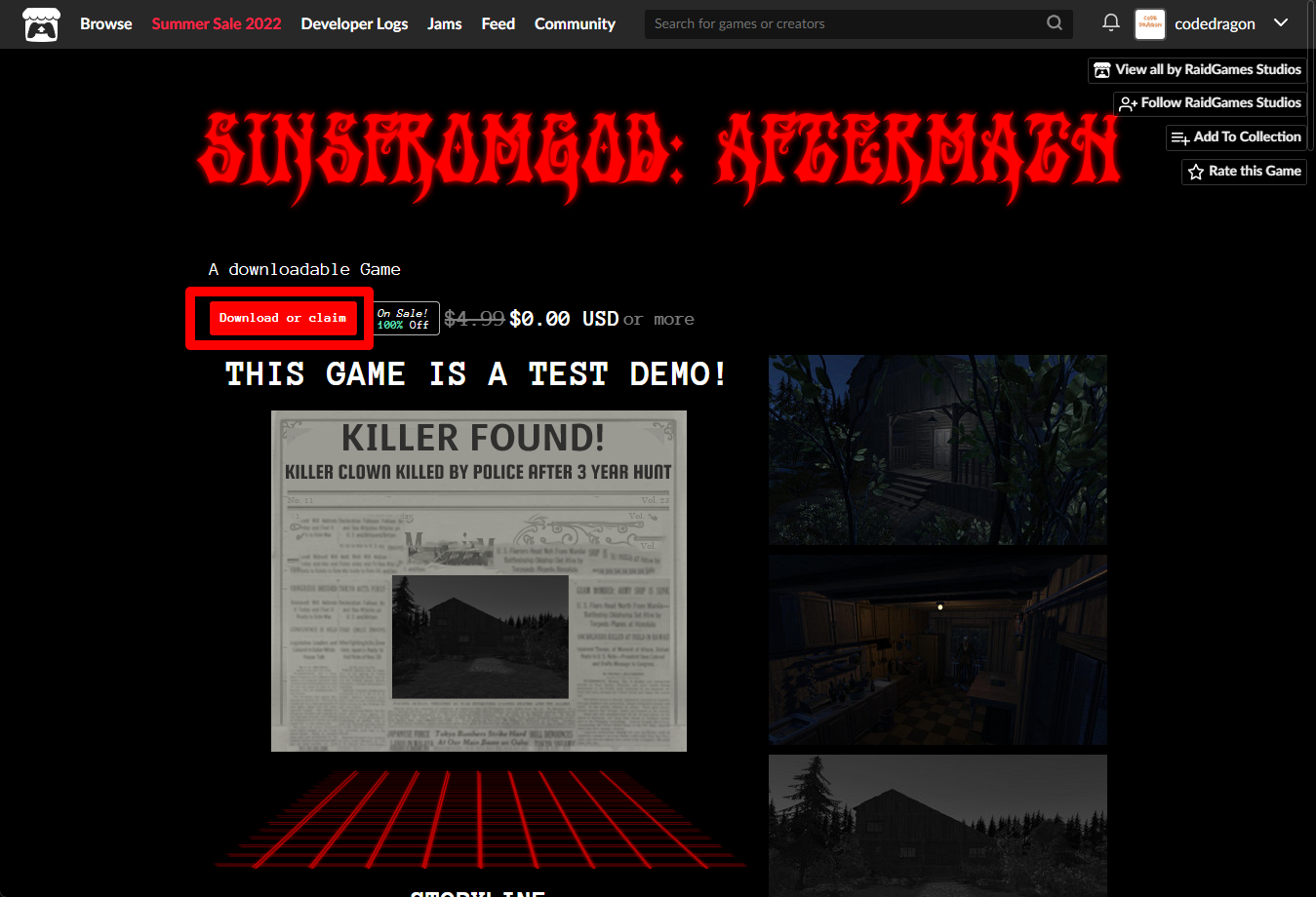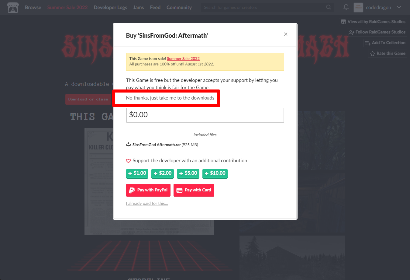 "SinsFromGod: Aftermath" 페이지에 있는 [Download or claim]을 클릭합니다.
