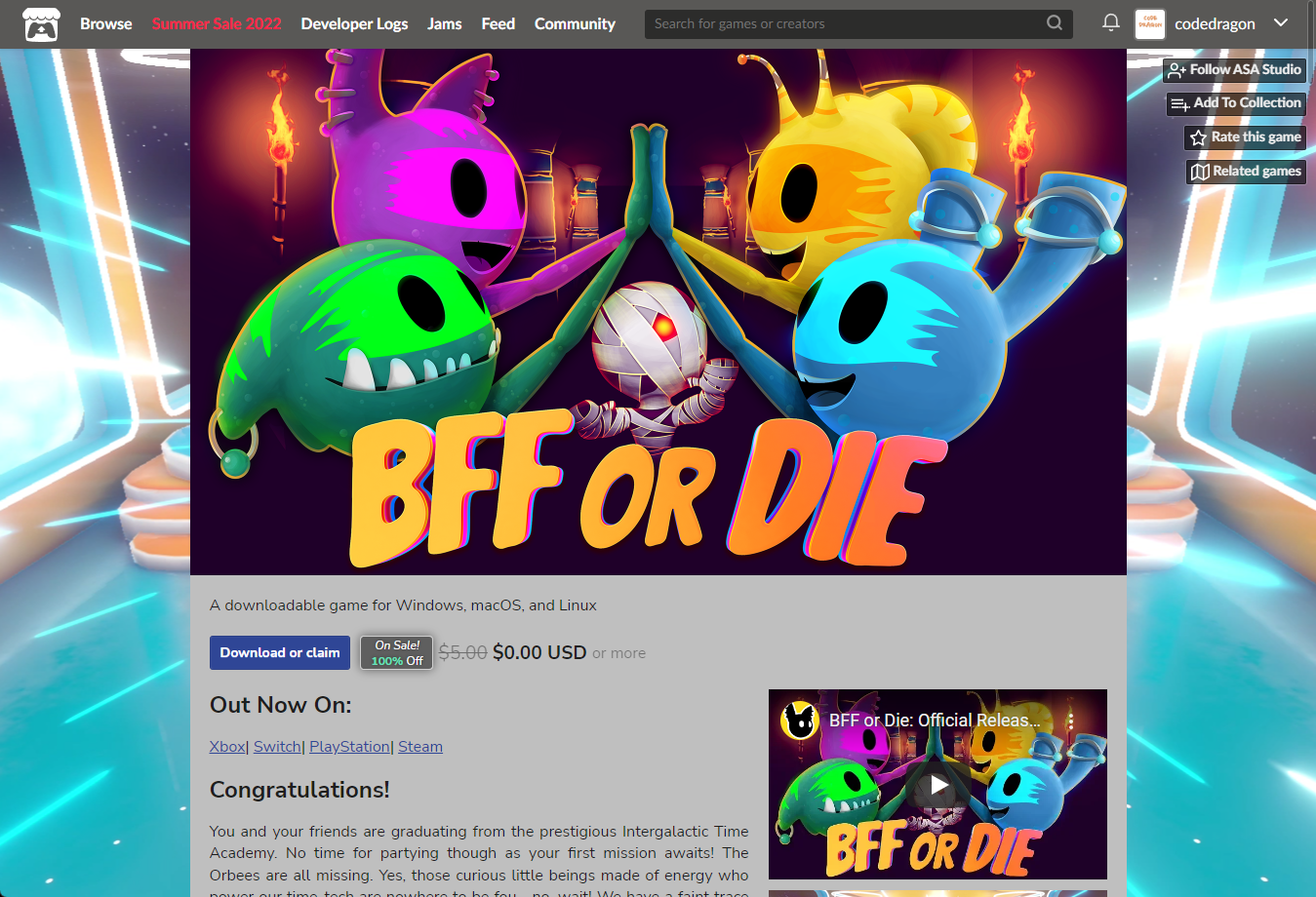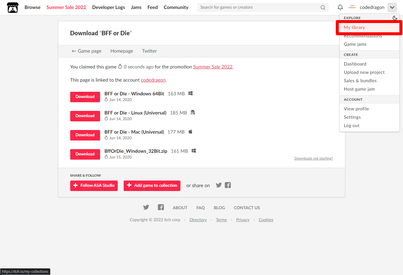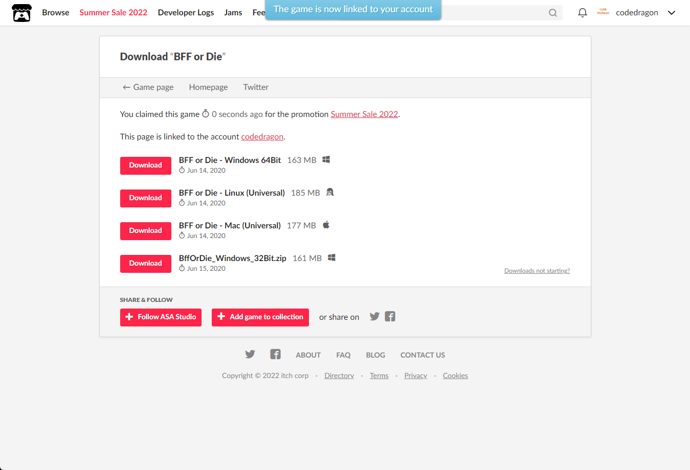 [Claim game]을 클릭하면 "BFF or Die" 게임이 나의 게임 라이브러리에 추가되고 설치파일을 다운받을 수 있는 페이지로 이동됩니다.