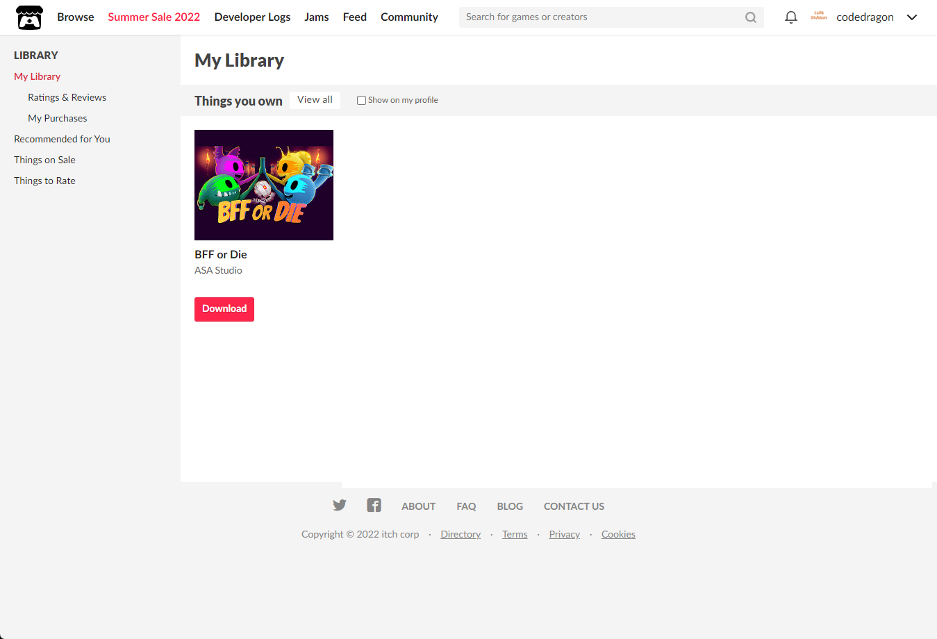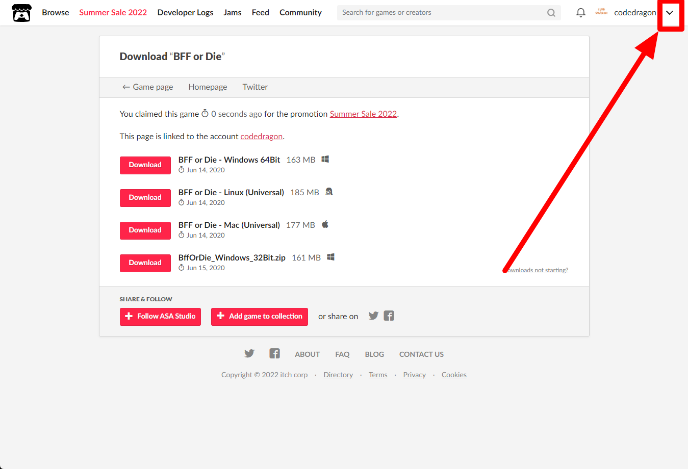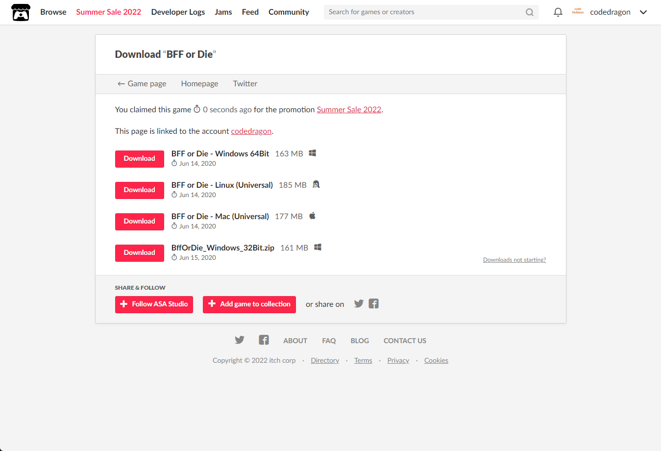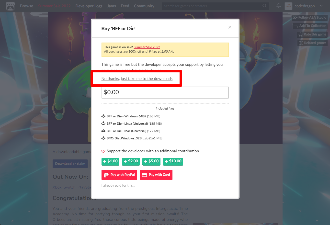 [Claim game]을 클릭하면 "BFF or Die" 게임이 나의 게임 라이브러리에 추가되고 설치파일을 다운받을 수 있는 페이지로 이동됩니다.