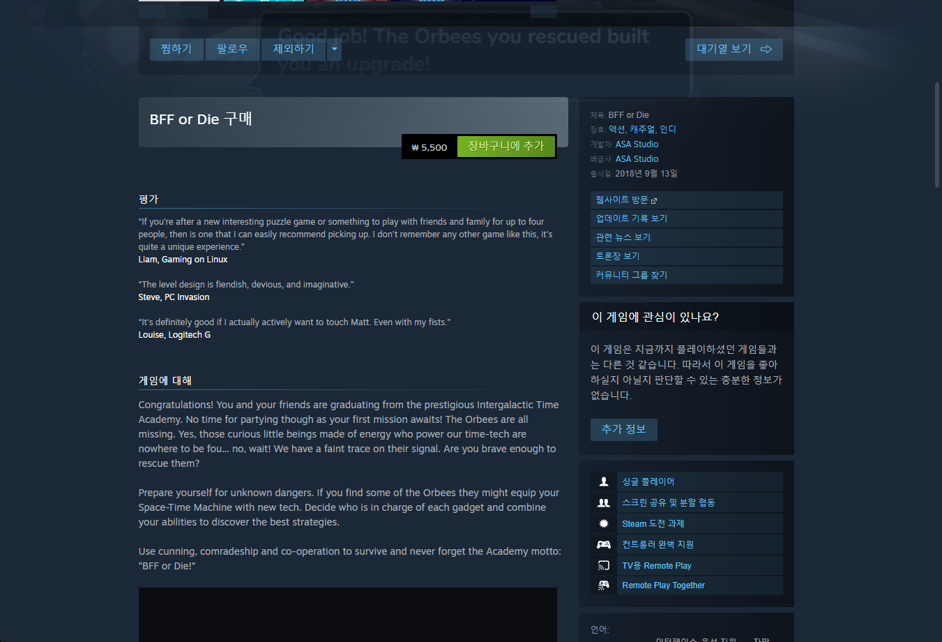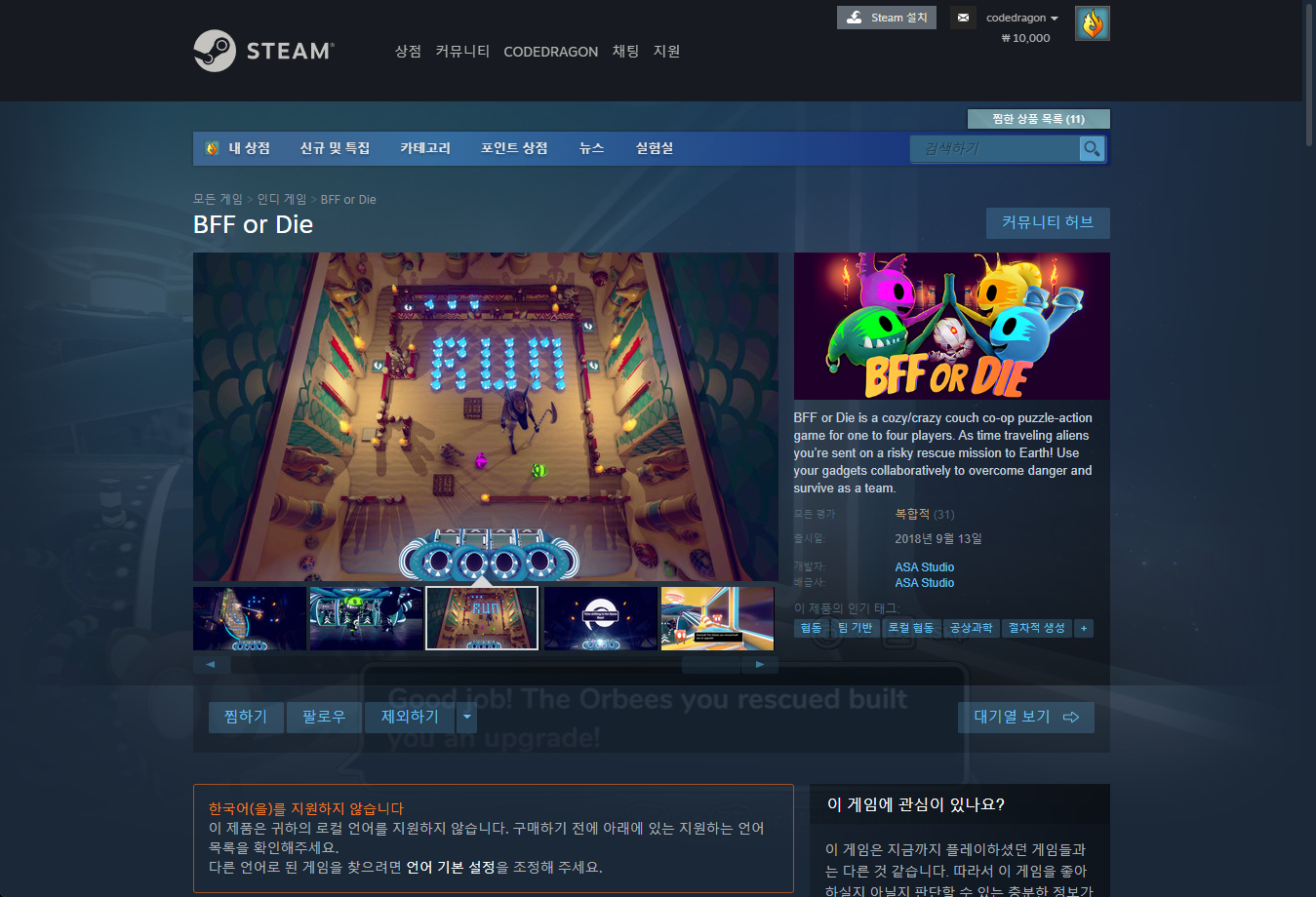 "퍼즐 액션" 게임인 "BFF or Die" 입니다.
