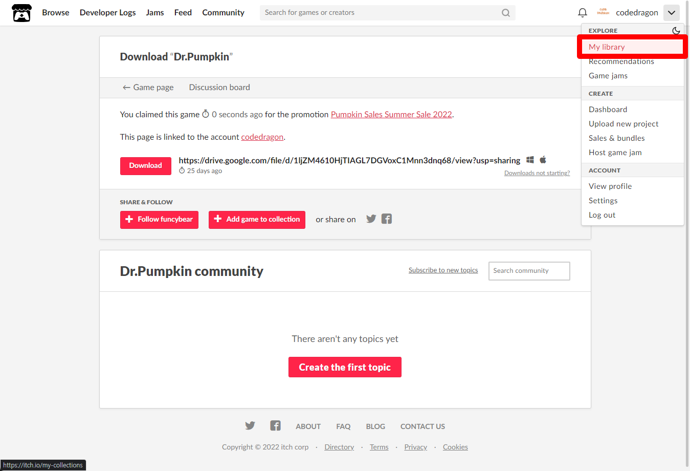 [Claim game]을 클릭하면 "Dr.Pumpkin" 게임이 나의 게임 라이브러리에 추가되고 설치파일을 다운받을 수 있는 페이지로 이동됩니다.
