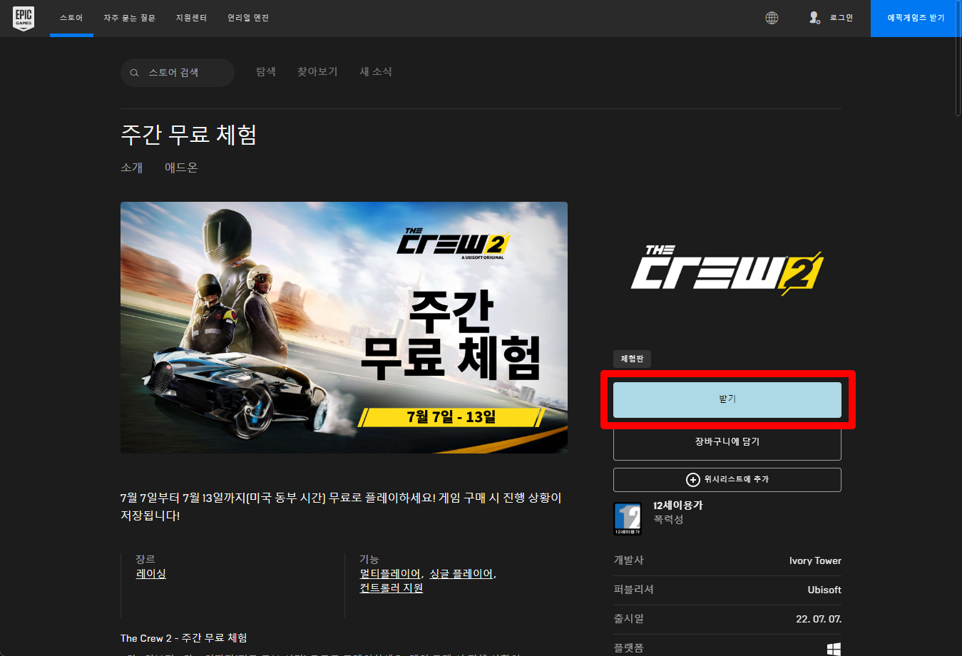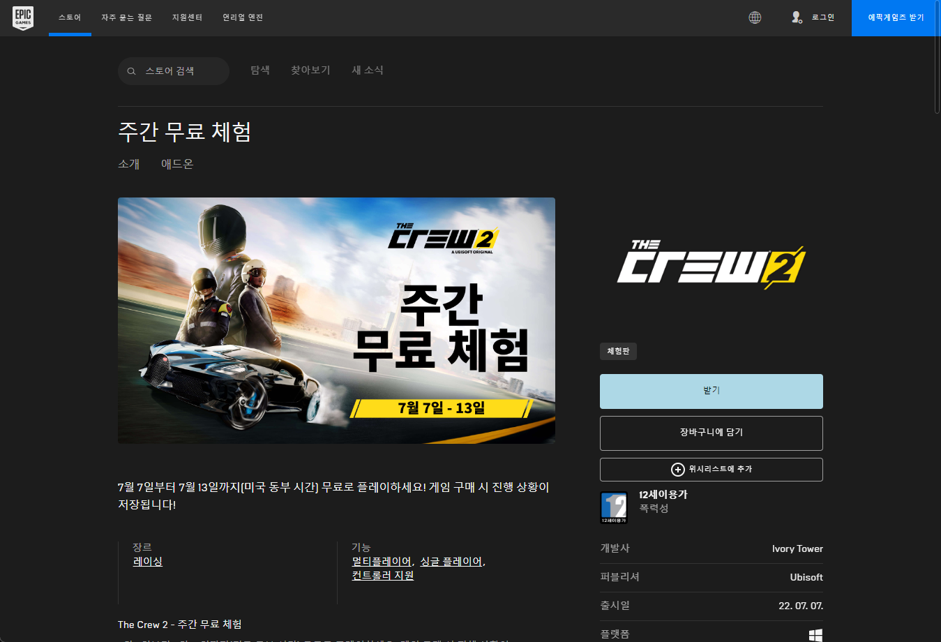 "The Crew 2" 에픽 이벤트 게임페이지에 접속합니다.