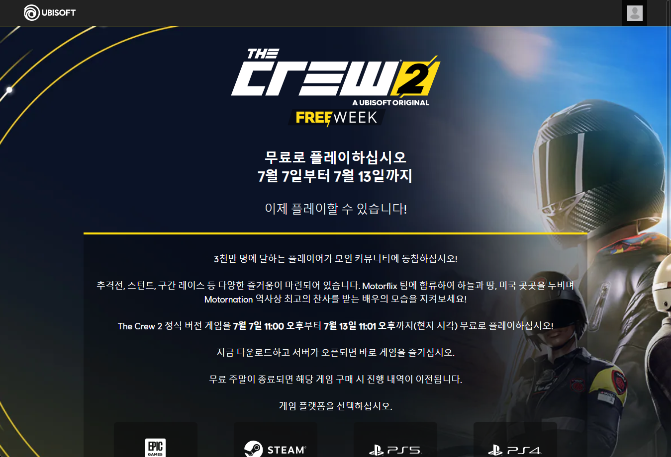 The Crew 2 더 크루 2 - Ubisoft 유비소프트 Epic 에픽 금주 무료 플레이 Play for Free weekend on UbiConnect Uplay & Epic