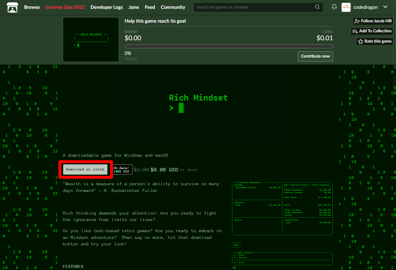 ₩2,592 -> ₩0(Free) Rich Mindset 리치 마인드셋 무료로 받기 영구소장 - itch.io 잇치 닷 아이오 한시적 무료 소장하기