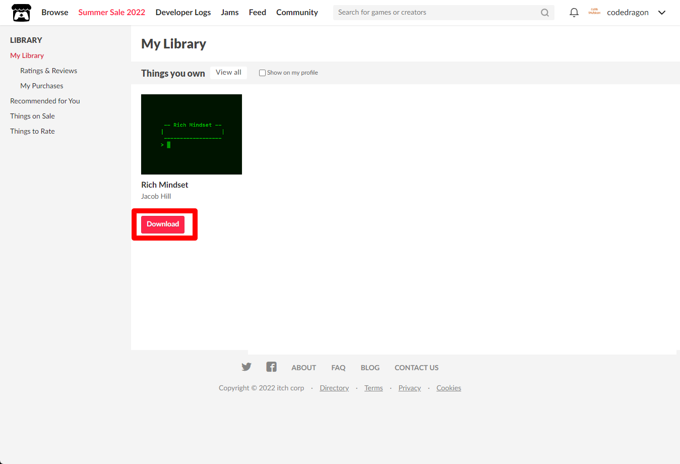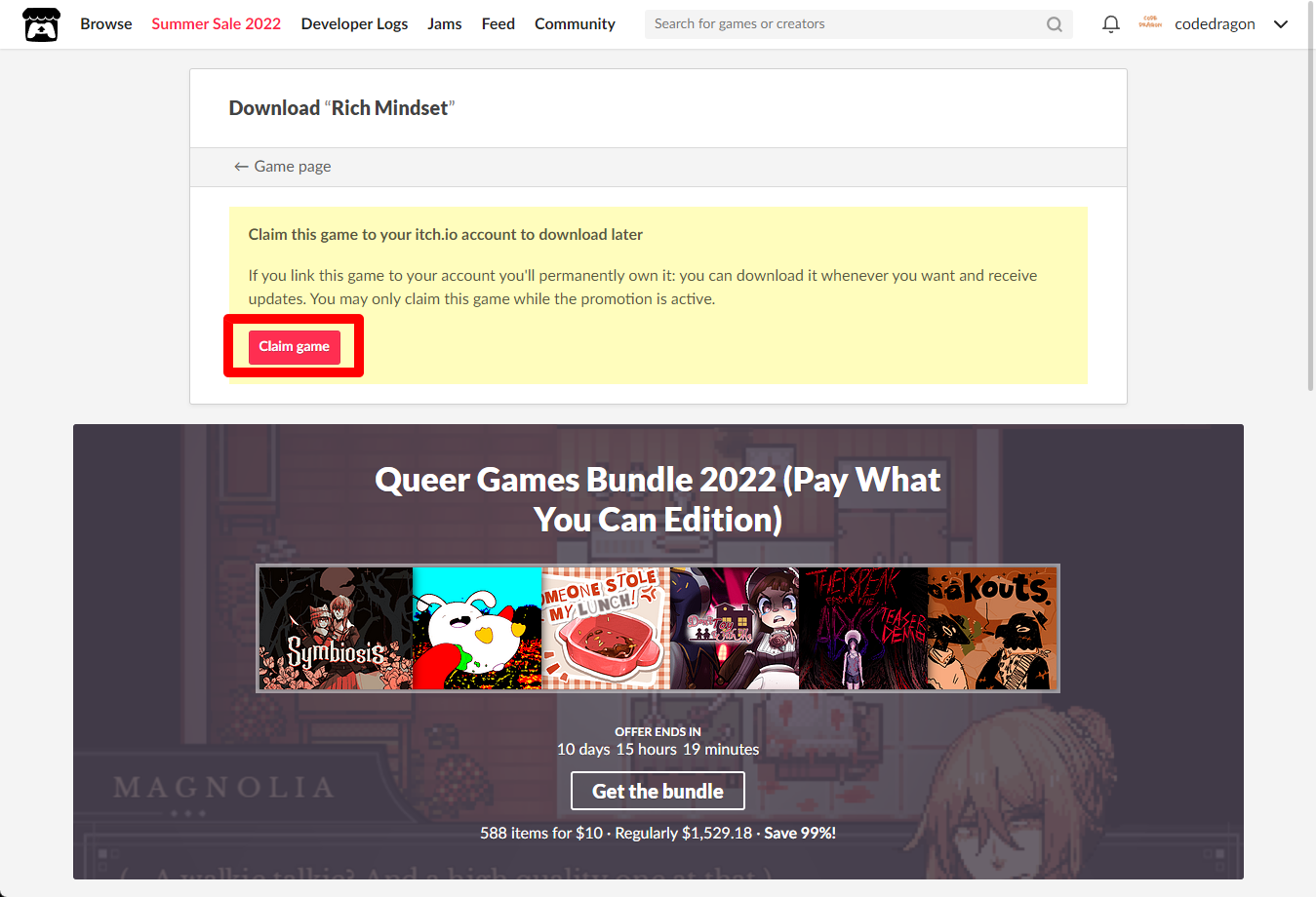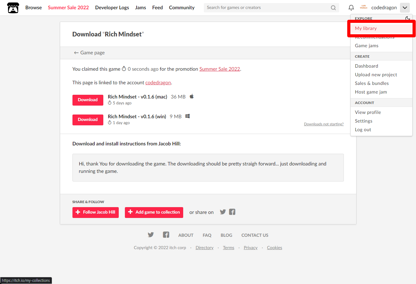 [Claim game]을 클릭하면 "Rich Mindset" 게임이 나의 게임 라이브러리에 추가되고 설치파일을 다운받을 수 있는 페이지로 이동됩니다.