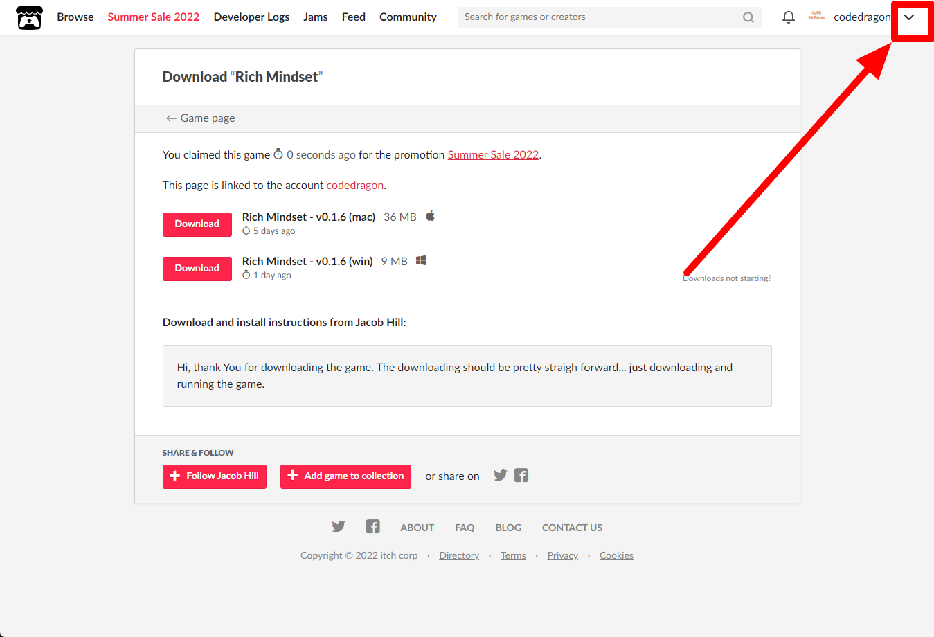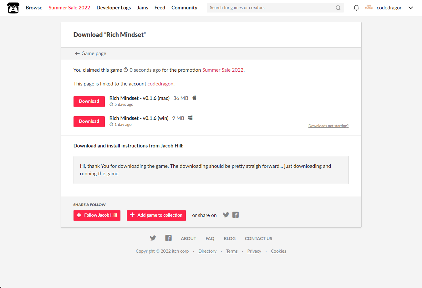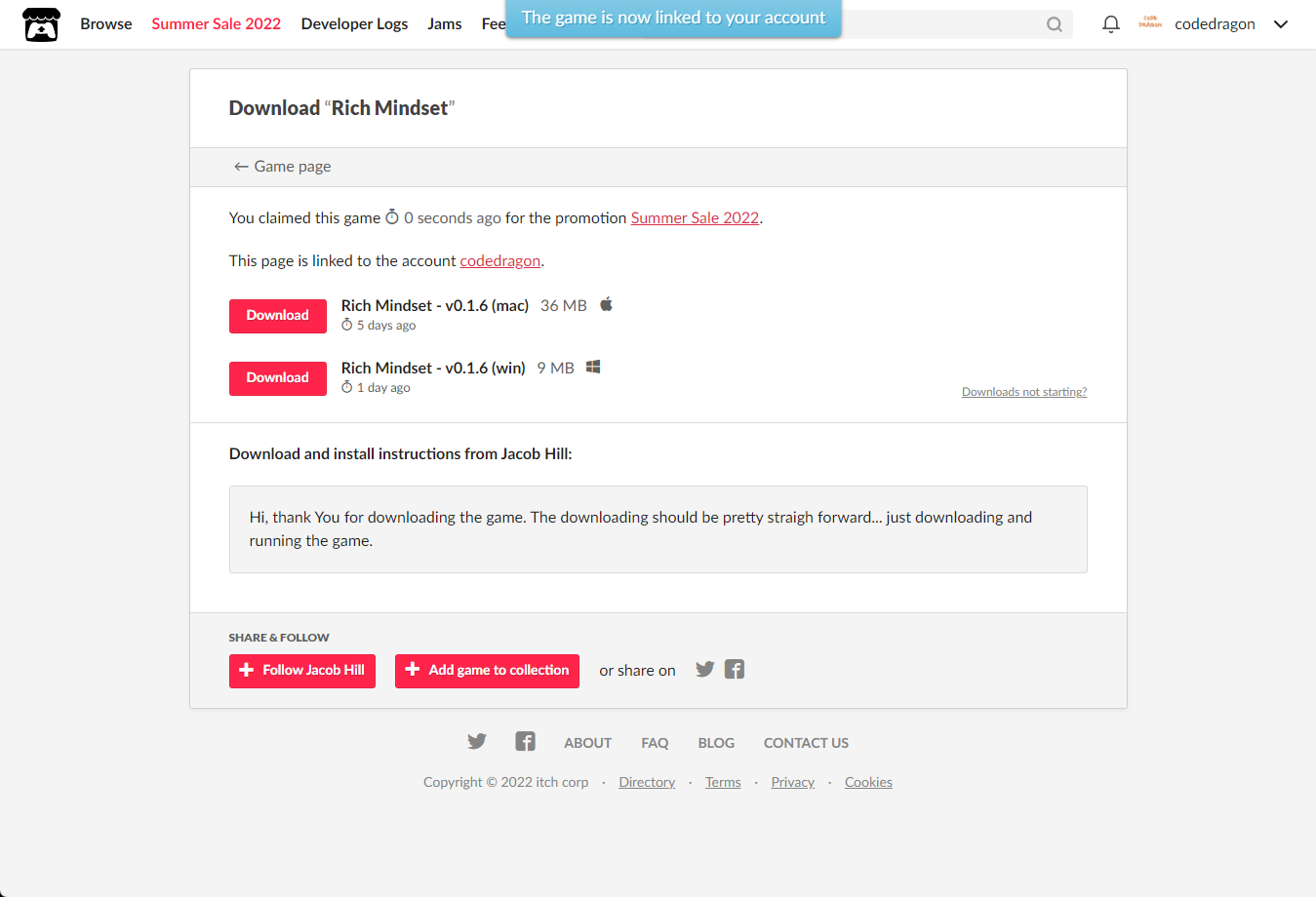[Claim game]을 클릭하면 "Rich Mindset" 게임이 나의 게임 라이브러리에 추가되고 설치파일을 다운받을 수 있는 페이지로 이동됩니다.