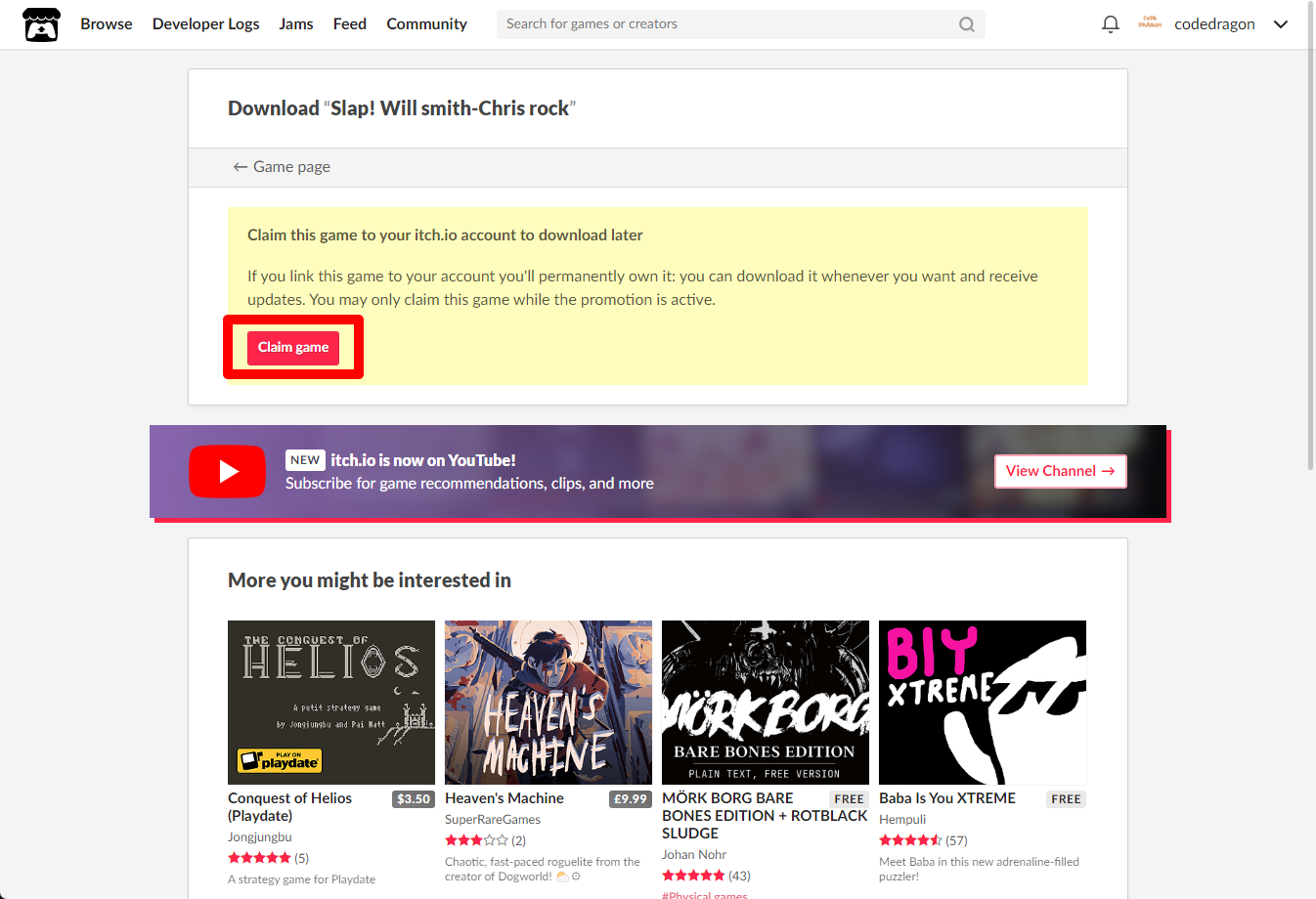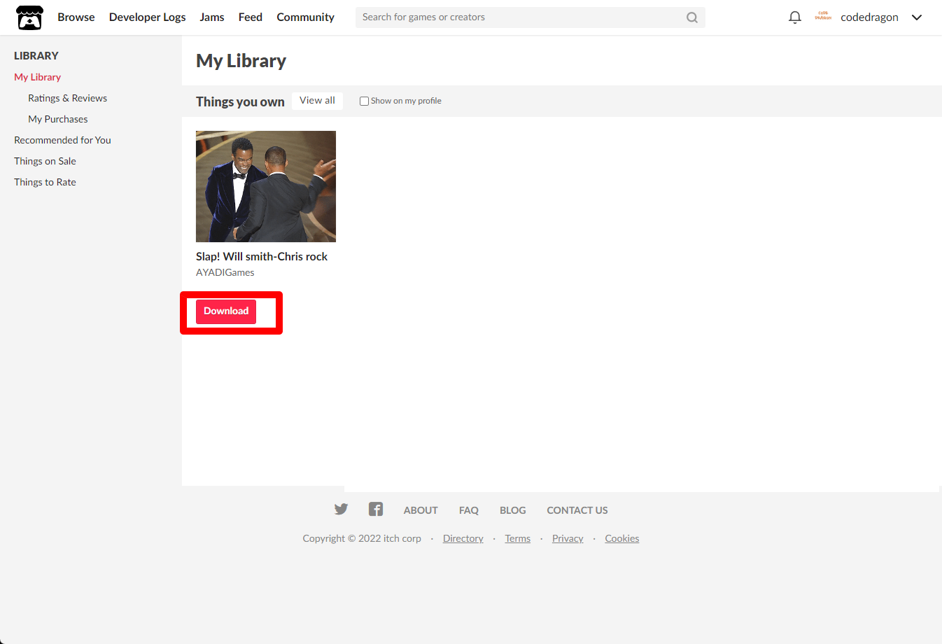 [Claim game]을 클릭하면 "Slap! Will smith-Chris rock" 게임이 나의 게임 라이브러리에 추가되고 설치파일을 다운받을 수 있는 페이지로 이동됩니다.
