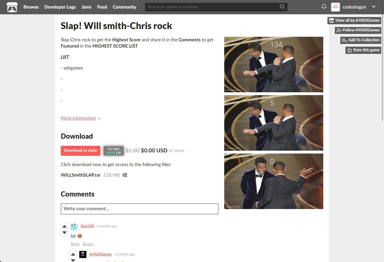 ₩1,307 -> ₩0(Free) Slap! Will smith-Chris rock 슬랩! 윌 스미스-크리스 록 무료로 받기 영구소장 - itch.io 잇치 닷 아이오 한시적 무료 소장하기