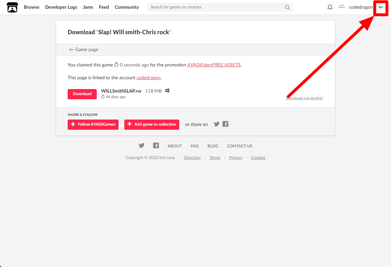 [Claim game]을 클릭하면 "Slap! Will smith-Chris rock" 게임이 나의 게임 라이브러리에 추가되고 설치파일을 다운받을 수 있는 페이지로 이동됩니다.