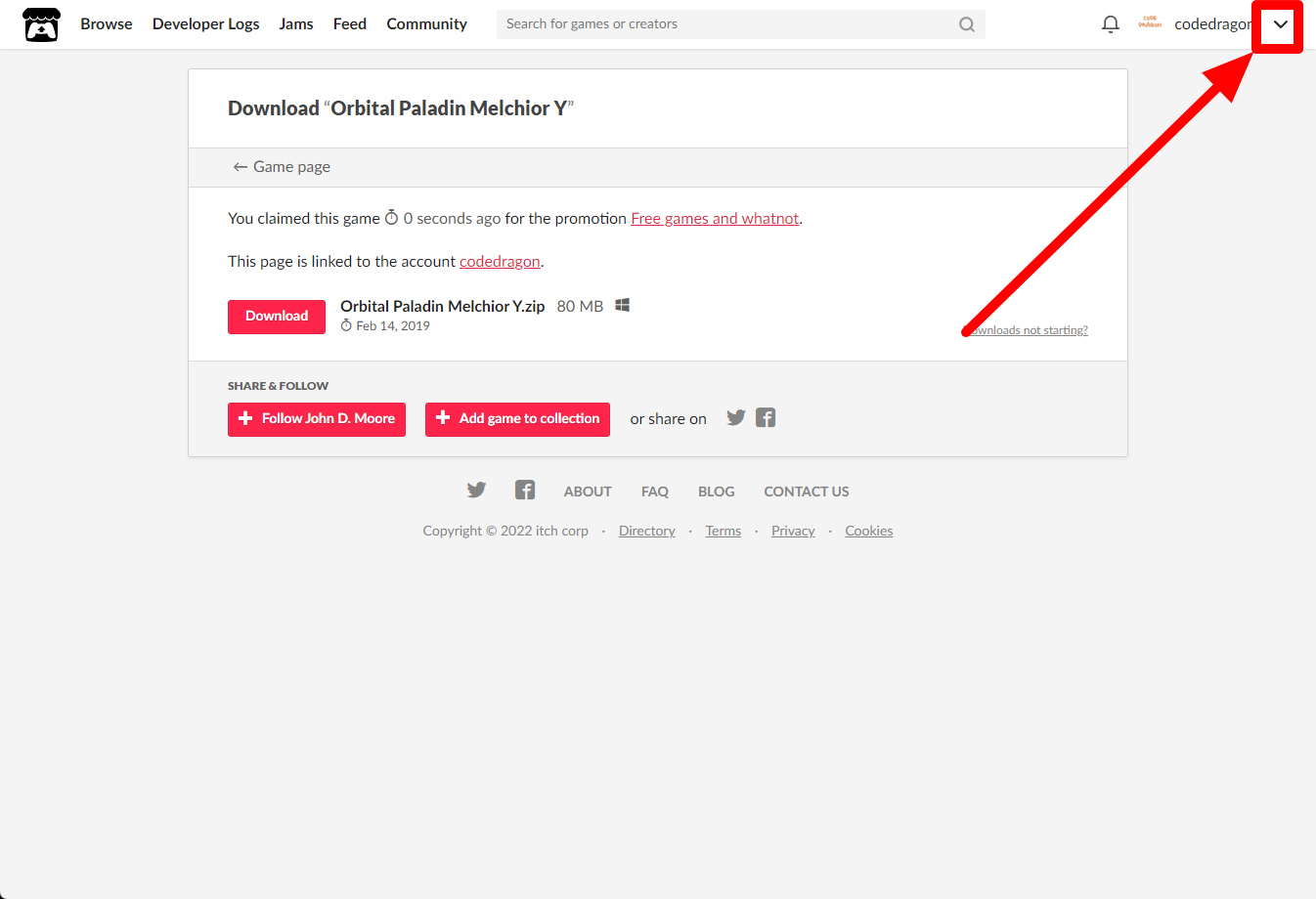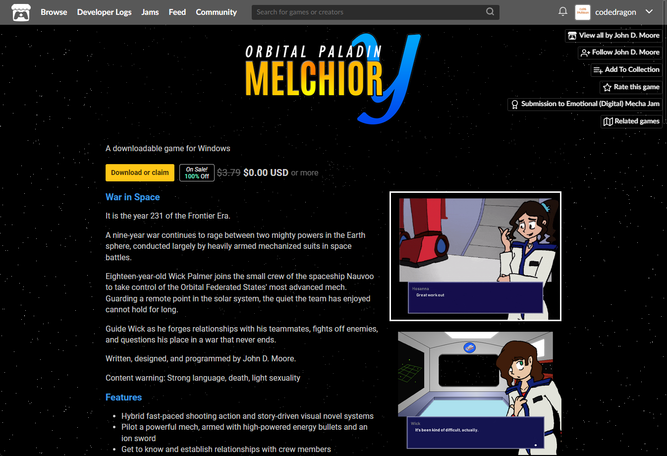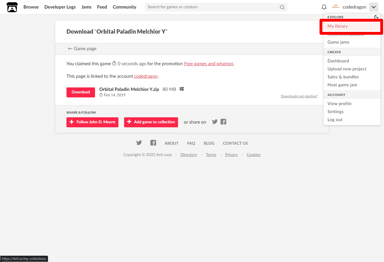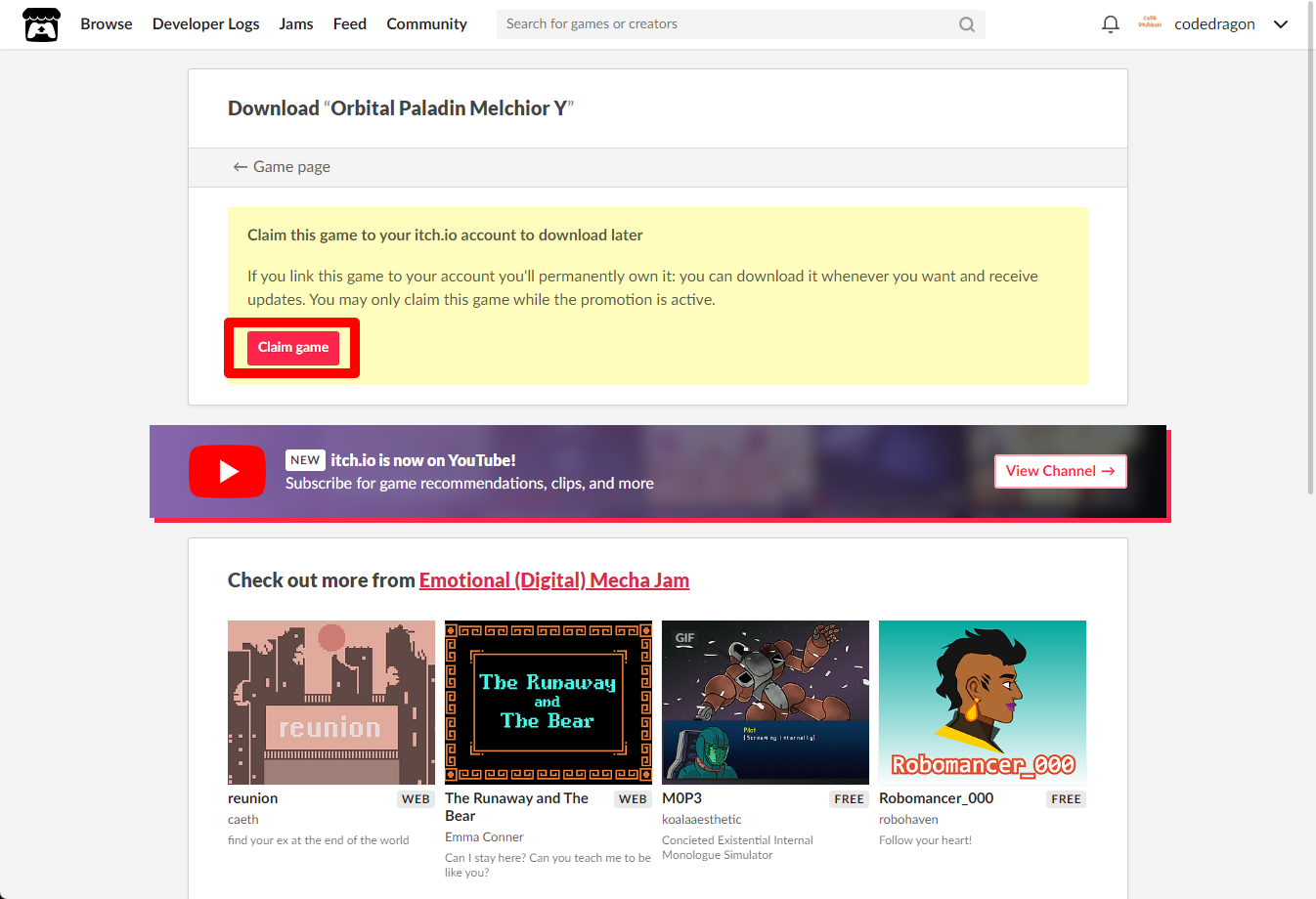 [Claim game]을 클릭하면 "Orbital Paladin Melchior Y" 게임이 나의 게임 라이브러리에 추가되고 설치파일을 다운받을 수 있는 페이지로 이동됩니다.