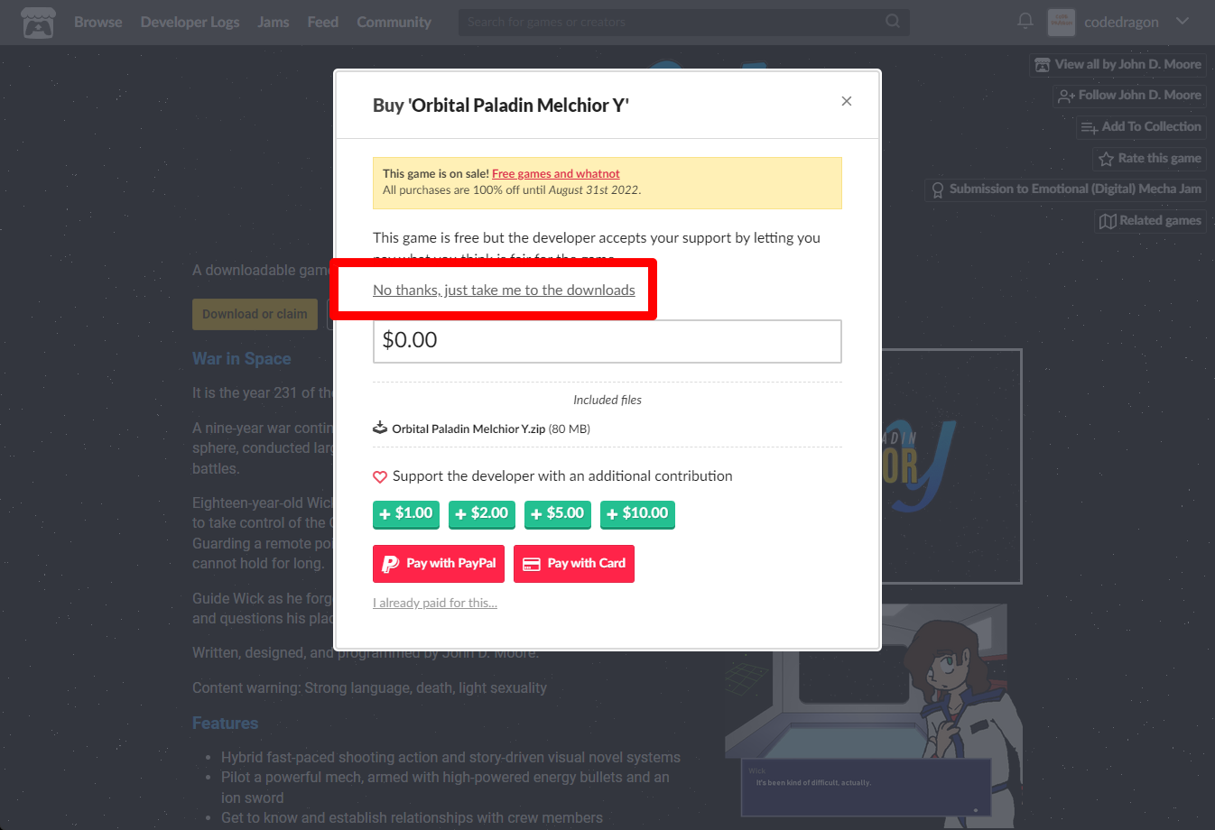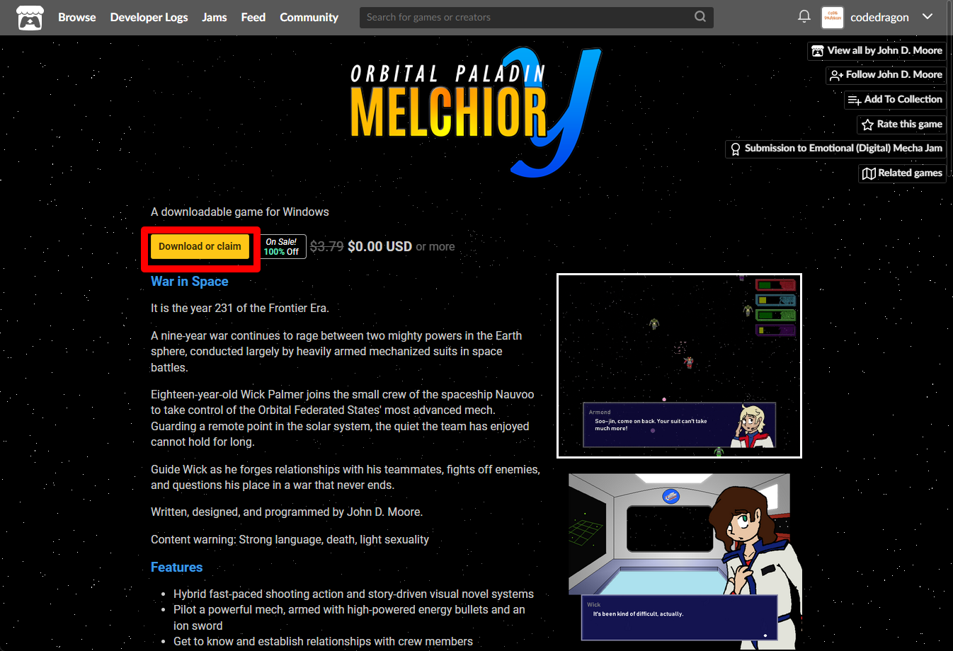 "Orbital Paladin Melchior Y" 페이지에 있는 [Download or claim]을 클릭합니다.