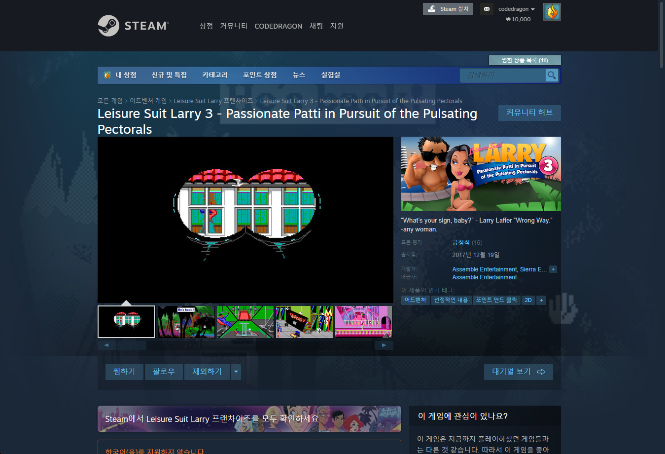 - "Leisure Suit Larry 3 - Passionate Patti in Pursuit of the Pulsating Pectorals" - Steam 스팀 페이지