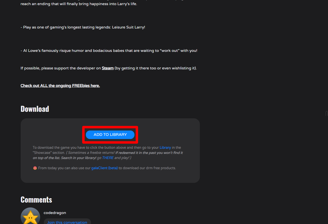"Leisure Suit Larry 3 - Passionate Patti in Pursuit of the Pulsating Pectorals" 게임 페이지를 내려 [ADD TO LIBRARY]를 클릭합니다.