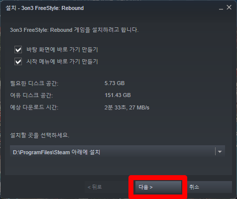 스팀런처 실행이 끝나면 원하는 위치에 "3on3 FreeStyle Rebound" 설치를 완료해 줍니다.