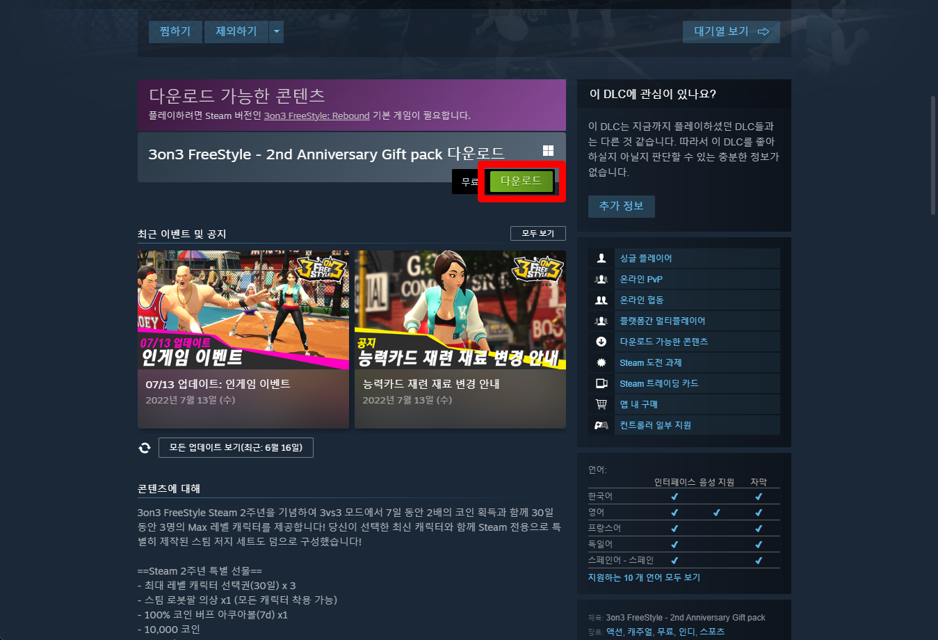 "3on3 FreeStyle - 2nd Anniversary Gift pack" 게임페이지를 조금 내려준 후 [다운로드] 버튼을 클릭하면 게임라이브러리에 추가됩니다.