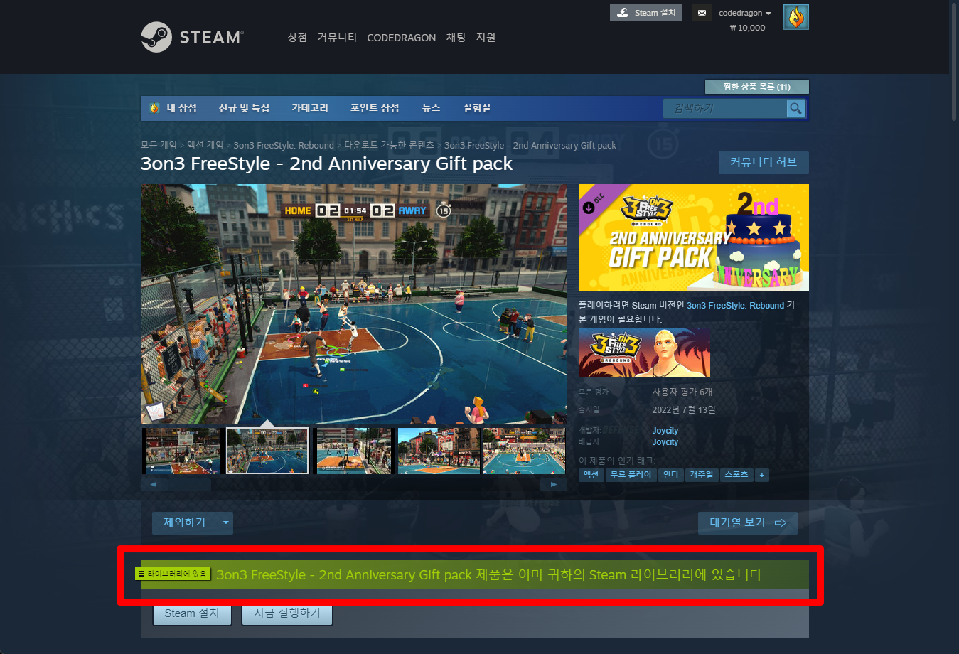 다시 "3on3 FreeStyle - 2nd Anniversary Gift pack" 게임페이지로 돌아와 보면 녹색으로 게임라이브러리에 추가되었음을 확인할 수 있습니다.