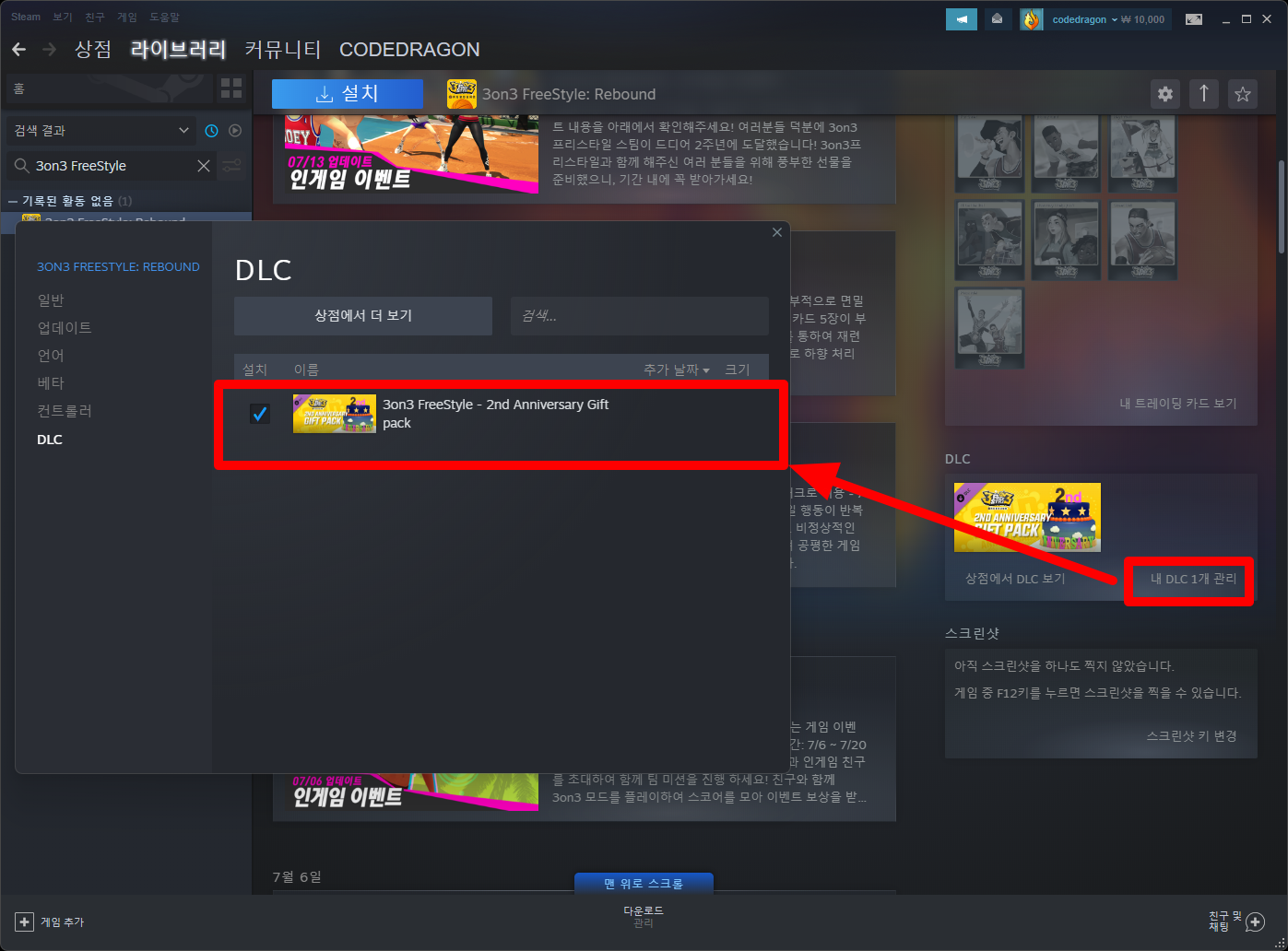 "3on3 FreeStyle - 2nd Anniversary Gift pack" 게임페이지를 조금 내려준 후 [다운로드] 버튼을 클릭하면 게임라이브러리에 추가됩니다.