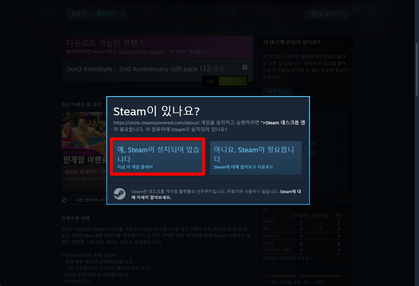 창이 하나 뜨면 Steam설치 유무에 따라 왼쪽 또는 오른쪽 버튼을 클릭합니다.