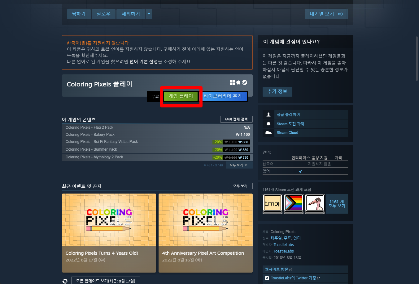 "Coloring Pixels" 페이지를 내려 [게임 플레이]를 클릭하면 됩니다.