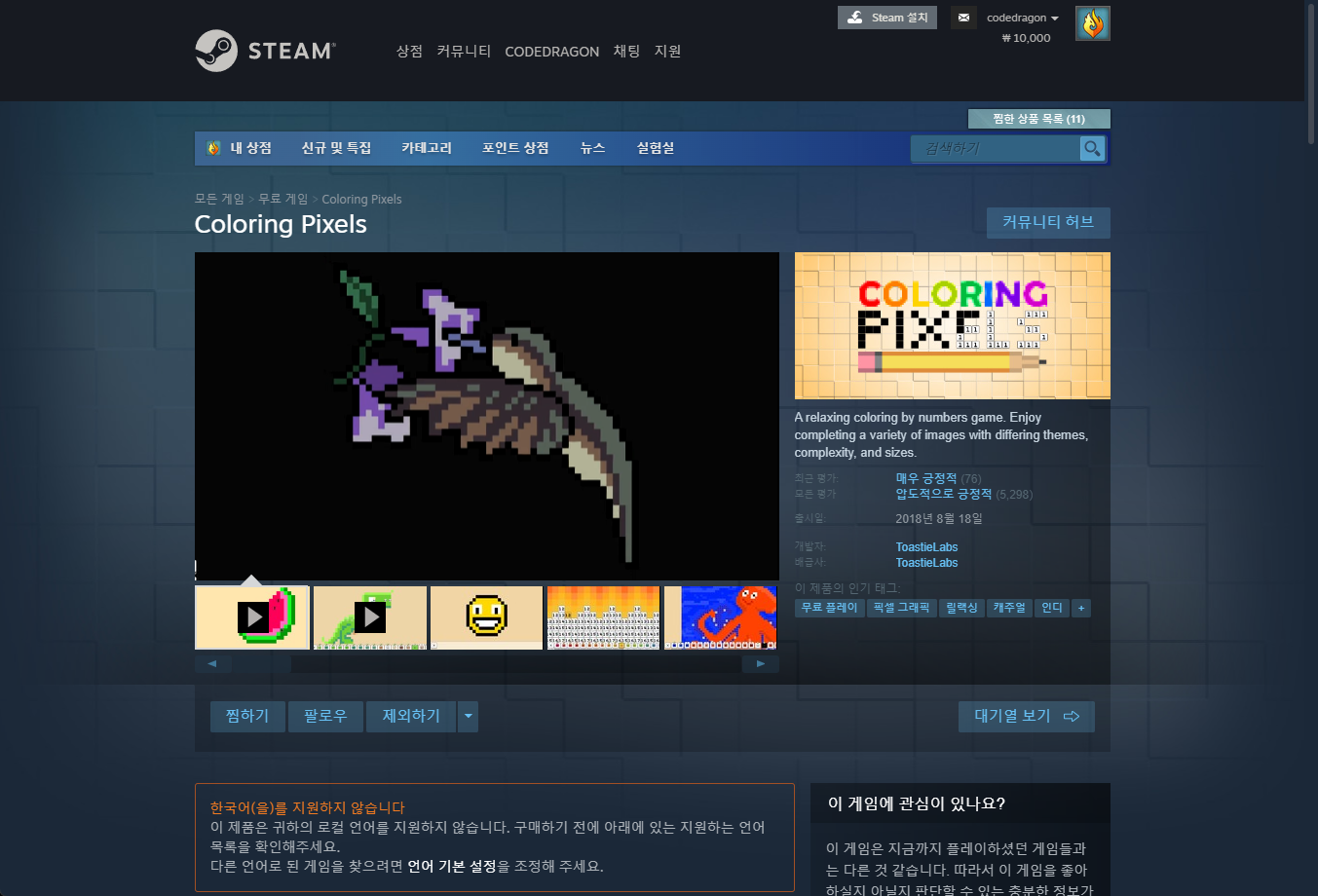 "Coloring Pixels" 스팀 페이지 입니다.
