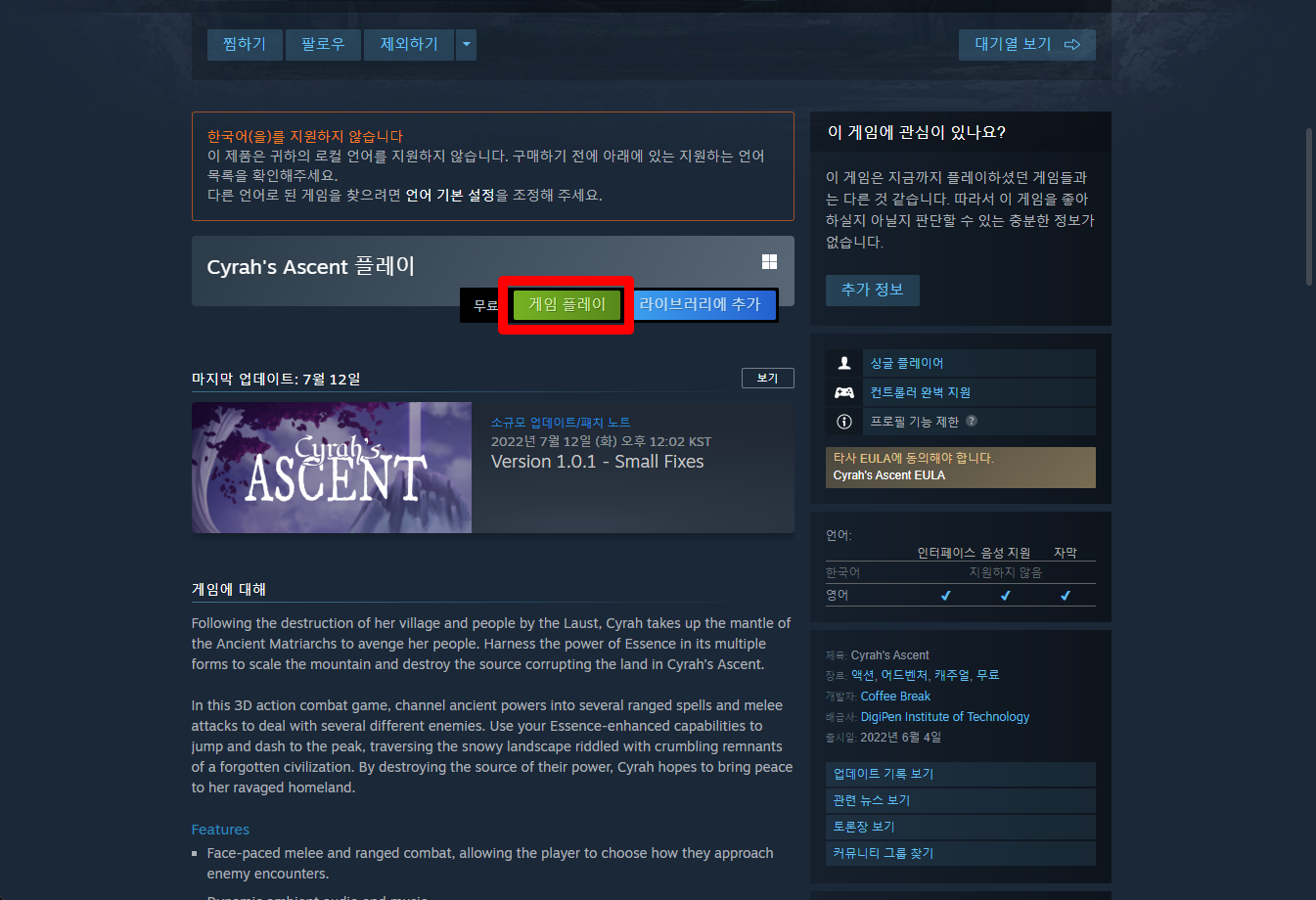 "Cyrah's Ascent" 페이지를 내려 [게임 플레이]를 클릭하면 됩니다.