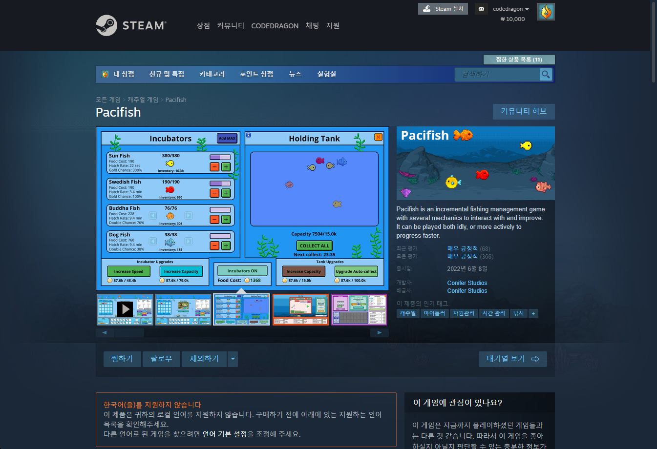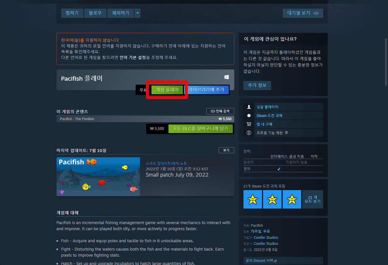 "Pacifish" 페이지를 내려 [게임 플레이]를 클릭하면 됩니다.