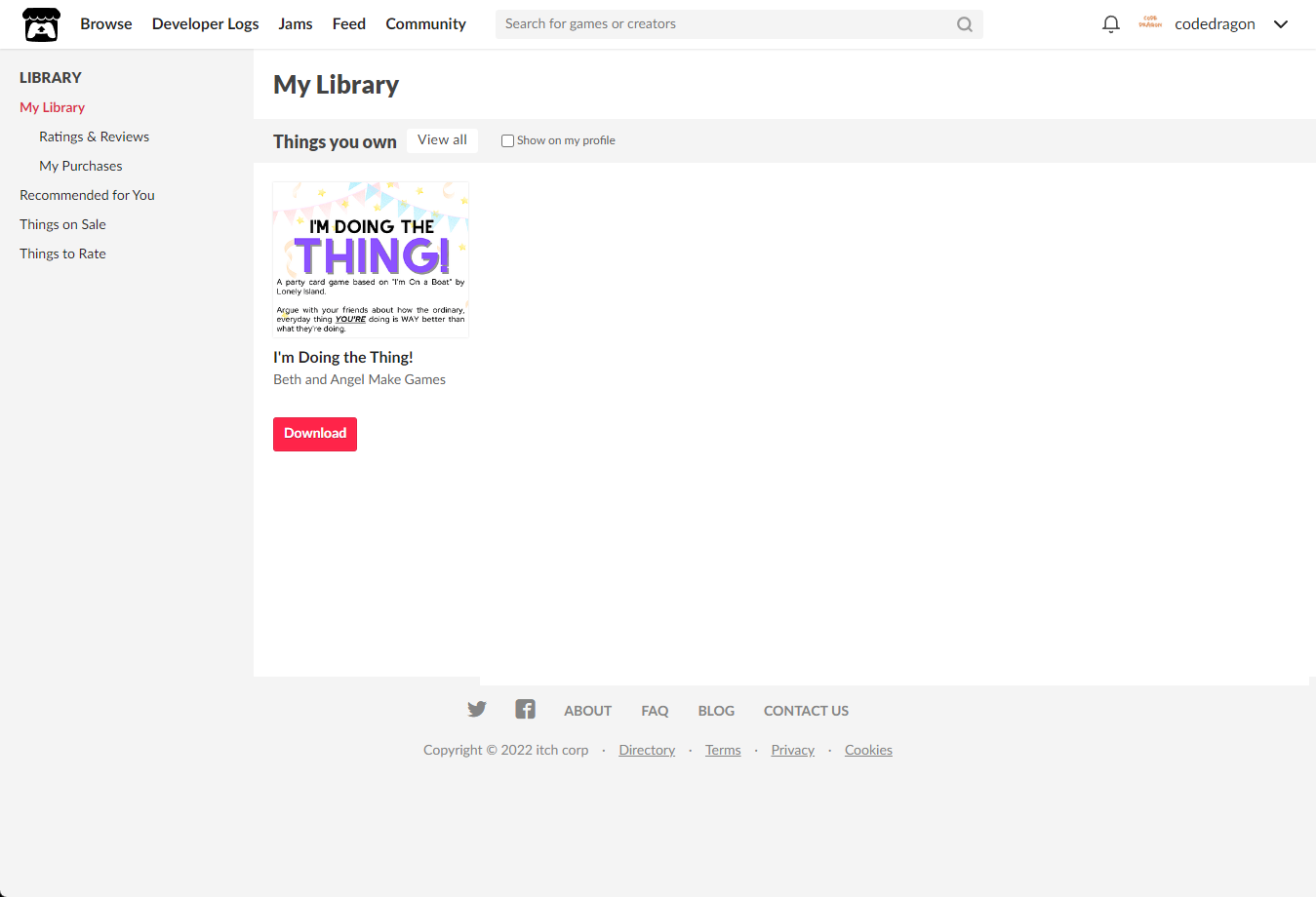 [Claim game]을 클릭하면 "I'm Doing the Thing!" 게임이 나의 게임 라이브러리에 추가되고 설치파일을 다운받을 수 있는 페이지로 이동됩니다.