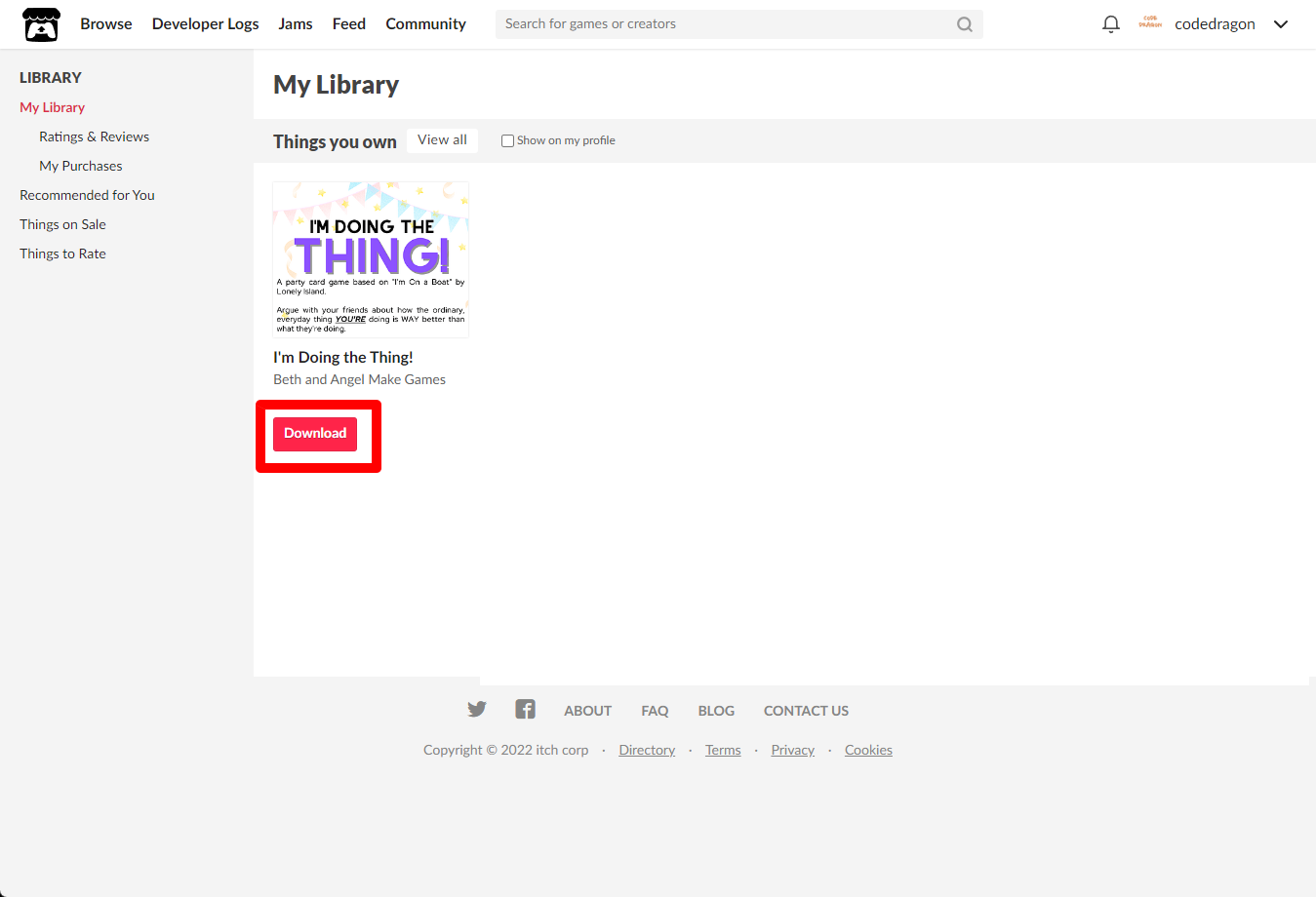 "My Lirary"에서 방금 받은 "I'm Doing the Thing!" 게임 항목을 확인할 수 있습니다.