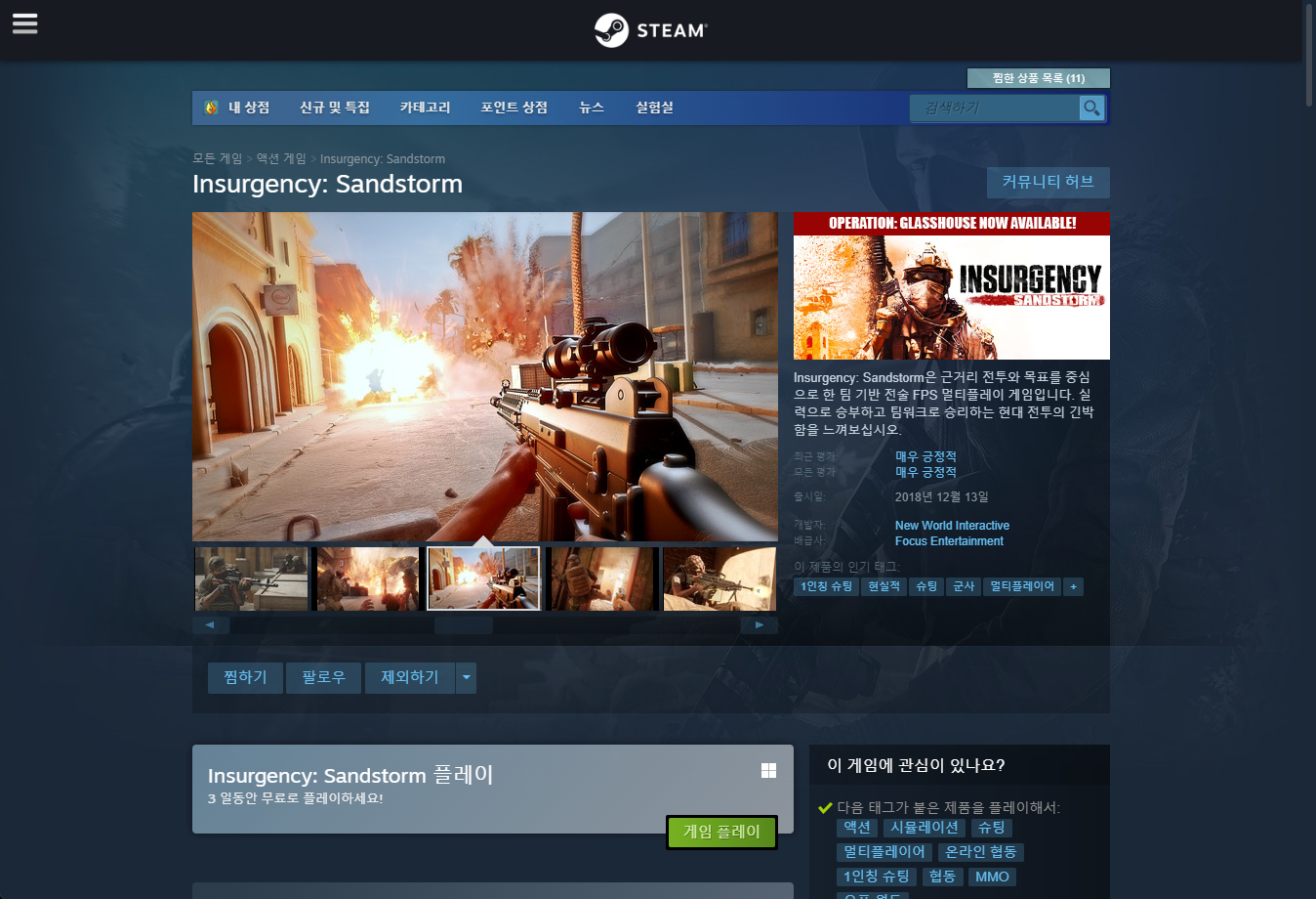 "Insurgency: Sandstorm" 게임페이지를 조금 내려서 [게임 플레이] 버튼을 클릭하면 됩니다.