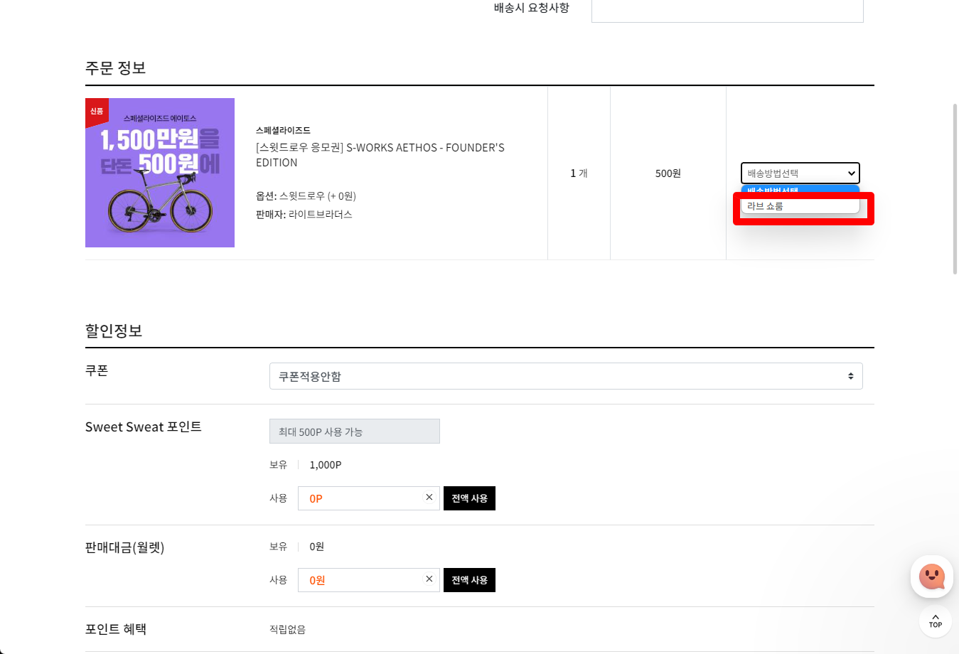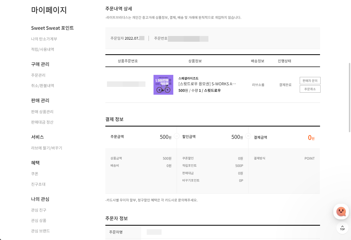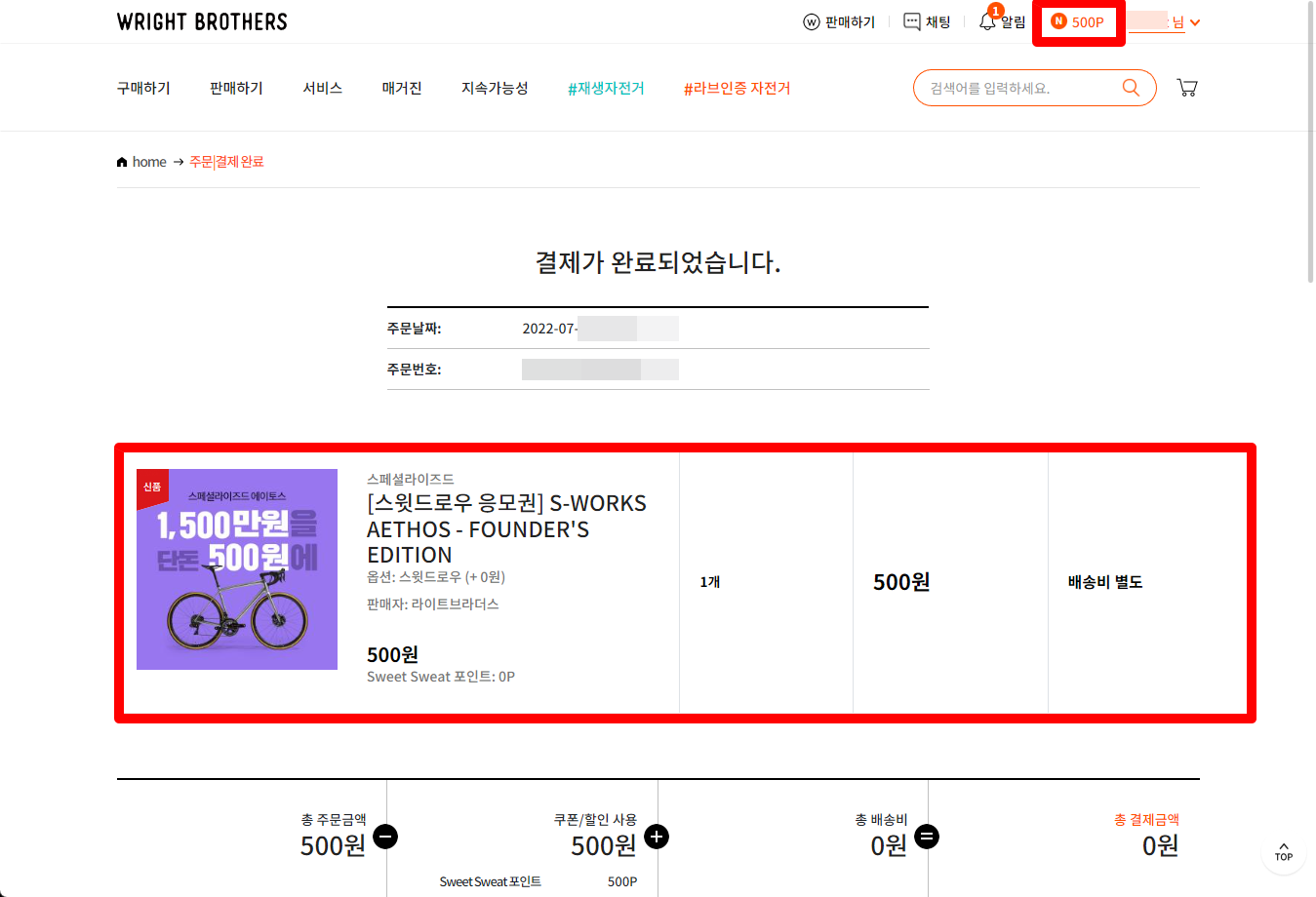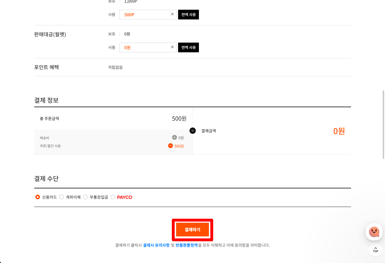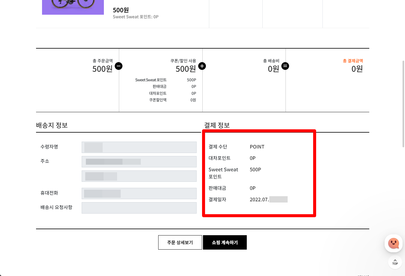 500포인트 사용으로 결제금액은 0원이 되었습니다.