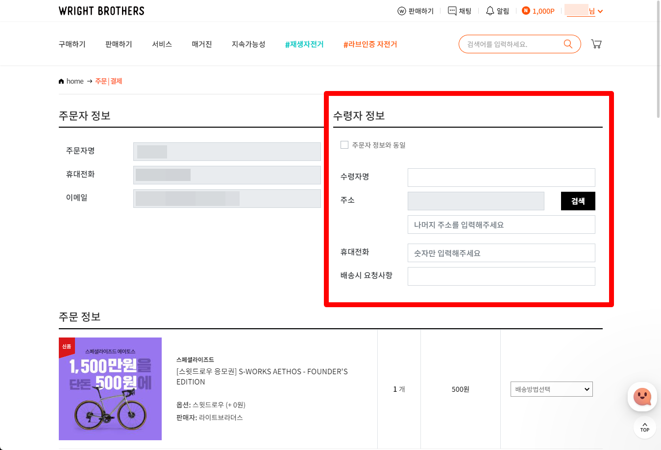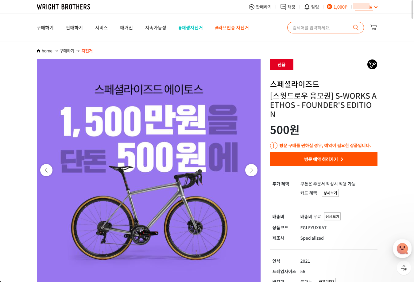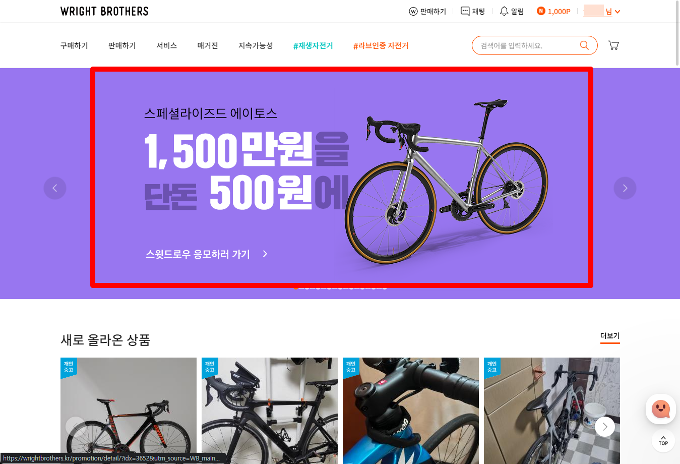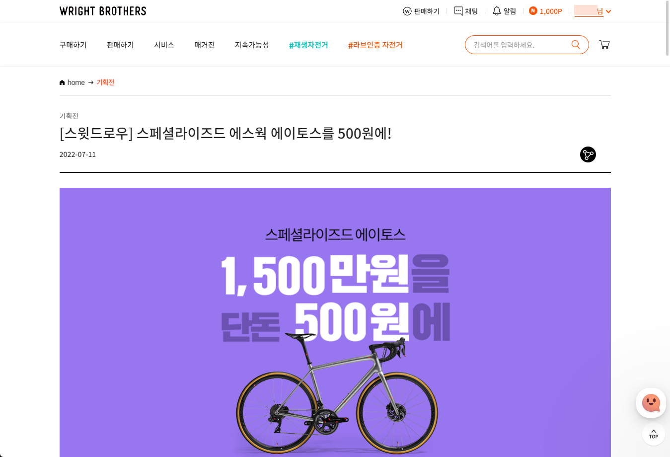 자전거 전문 중고거래 사이트인 WRIGHT BROTHERS 라이트브라더스에서 진행중인 1,500만원 에스웍 자전거를 500원으로 구매할 수 있는 응모 이벤트가 진행되어 한번 응모해보았습니다.