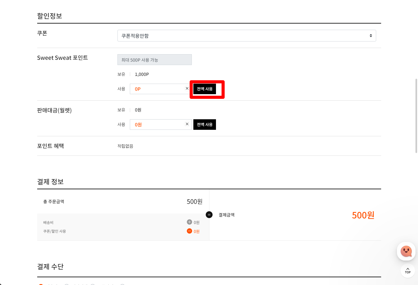 포인트에서 구매금액 500원을 포인트로 구매하기 위해 [전액 사용] 클릭합니다.