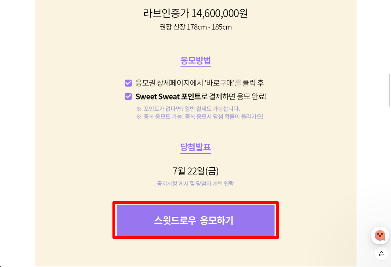 페이지를 내려서 [스윗드로우 응모하기] 클릭합니다.