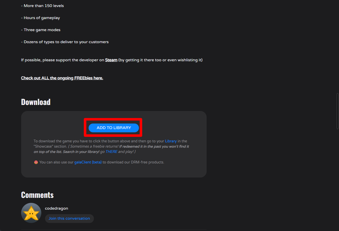 "Top Burger" 게임 페이지를 내려 [ADD TO LIBRARY]를 클릭합니다.