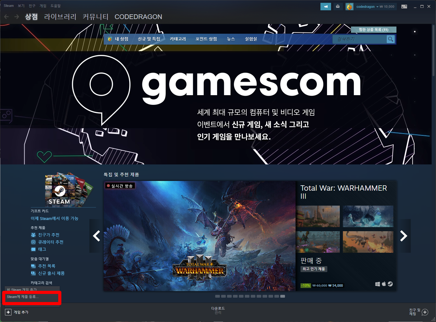나오는 메뉴에서 [Steam에 제품 등록]을 클릭합니다.