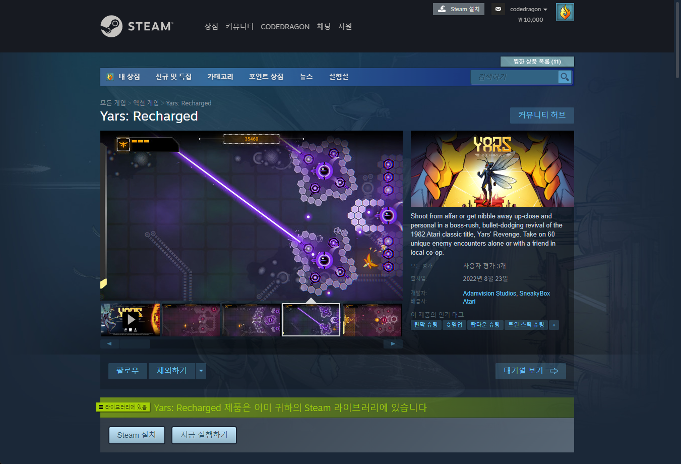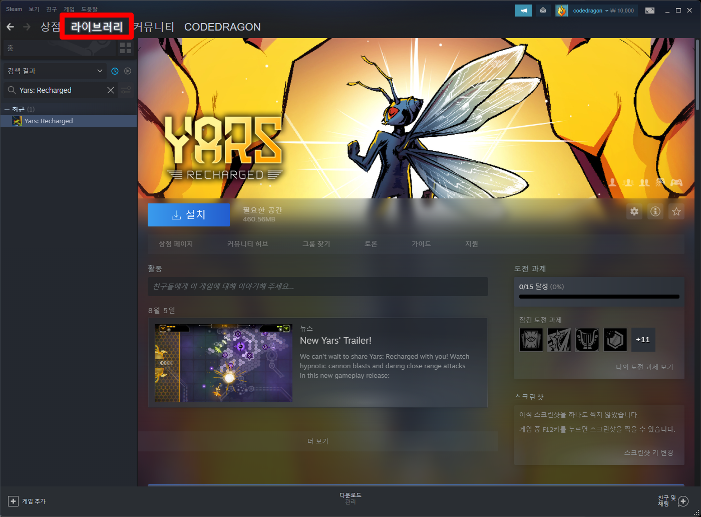 나의 게임 라이브러리에서 등록한 "Yars: Recharged" 항목을 확인할 수 있습니다