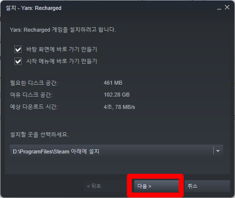 제품설치창이 오픈되면 원하는 위치에 "Yars: Recharged"를 설치해 줍니다.