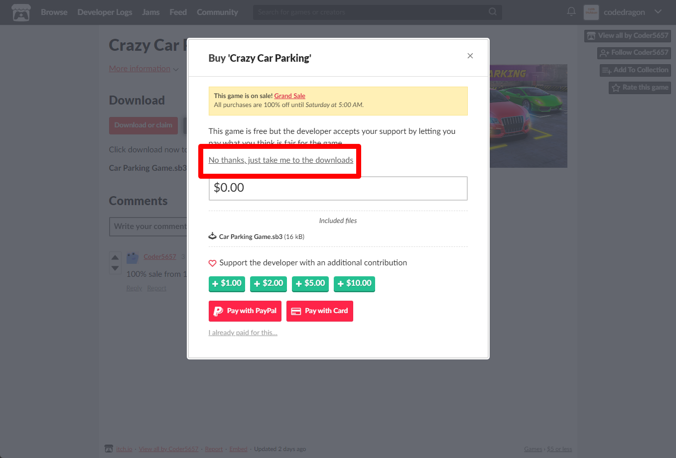 "Crazy Car Parking" 구매창에서 [No thanks, just take me to the downloads] 링크를 클릭합니다.
