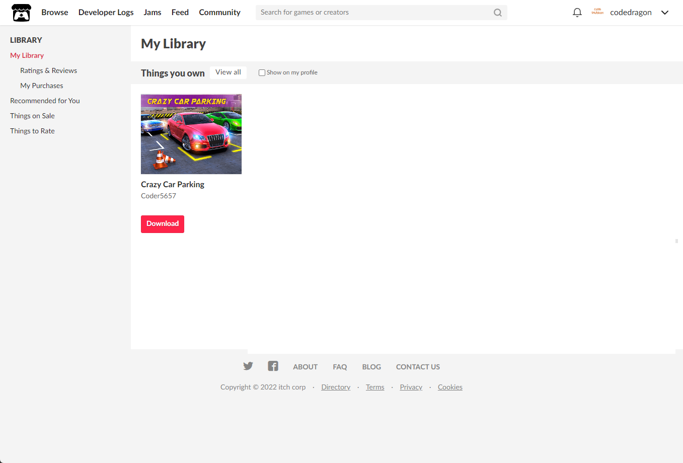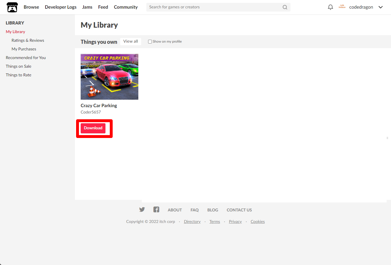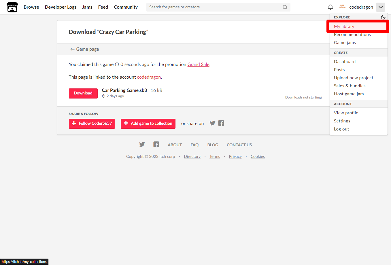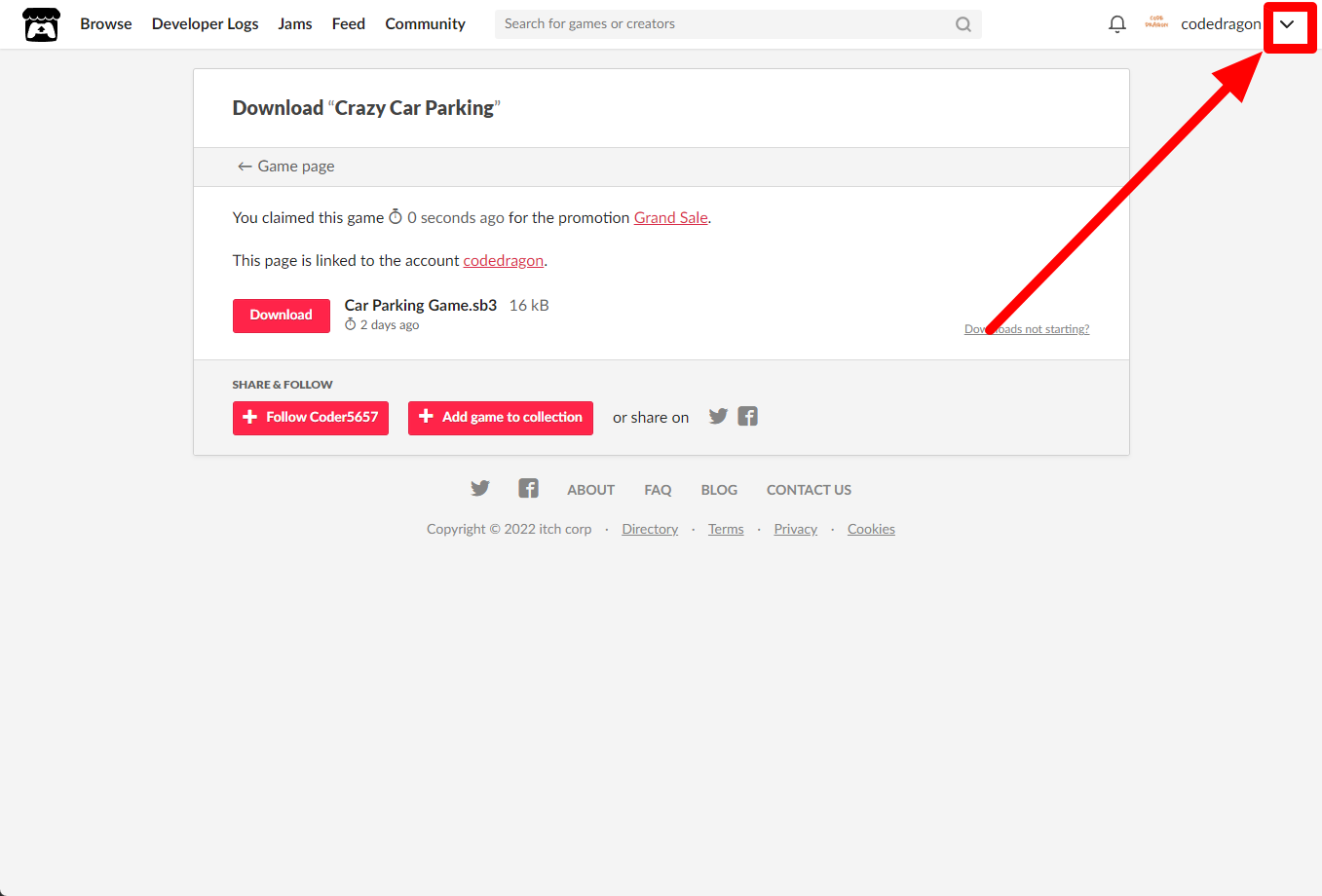 itch.io에서 받은 "Crazy Car Parking" 게임 확인하고 설치파일 다운받아 보겠습니다. 우측 상단의 나의 사용자명 오른쪽의 화살표 아이콘을 클릭합니다.
