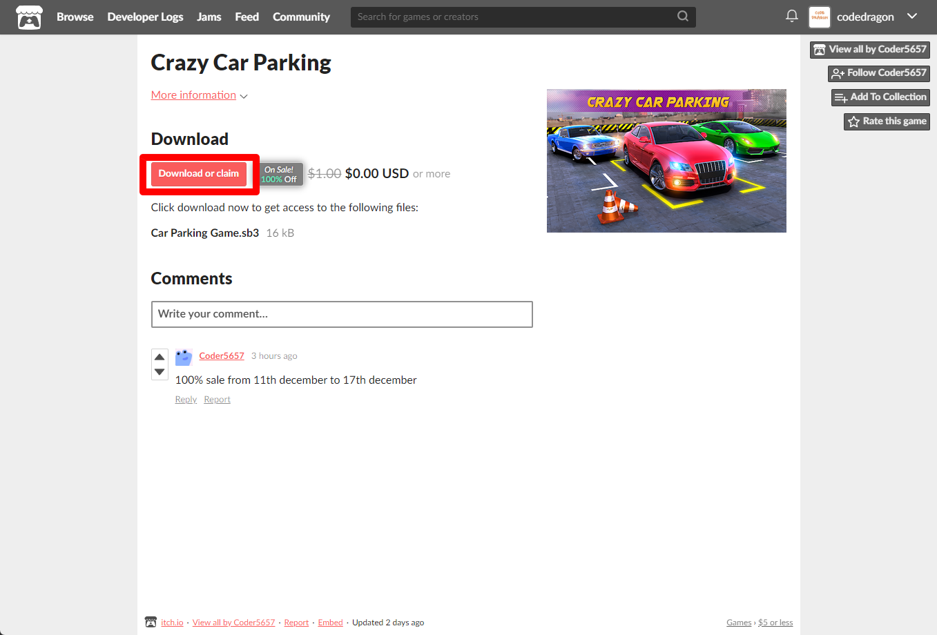 "Crazy Car Parking" 페이지에 있는 [Download or claim]을 클릭합니다.