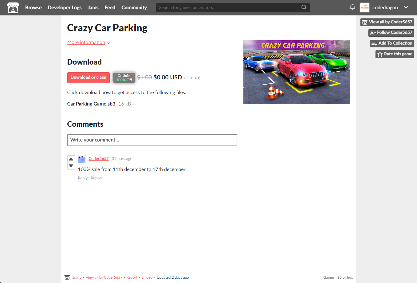 ₩1,298 -> ₩0(Free) Crazy Car Parking 크레이지 카 파킹 무료로 받기 영구소장 - itch.io 잇치 닷 아이오 한시적 무료 소장하기
