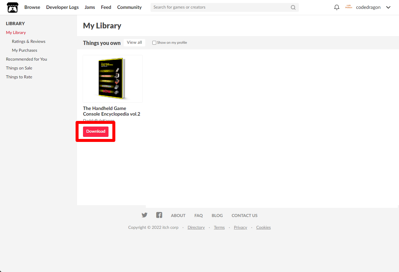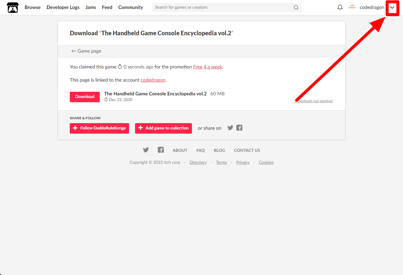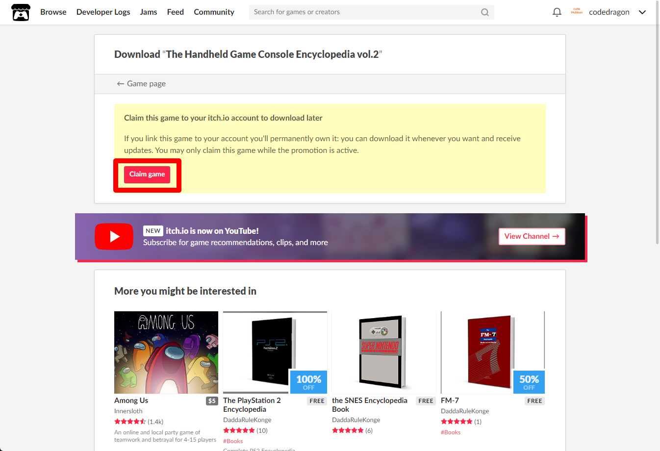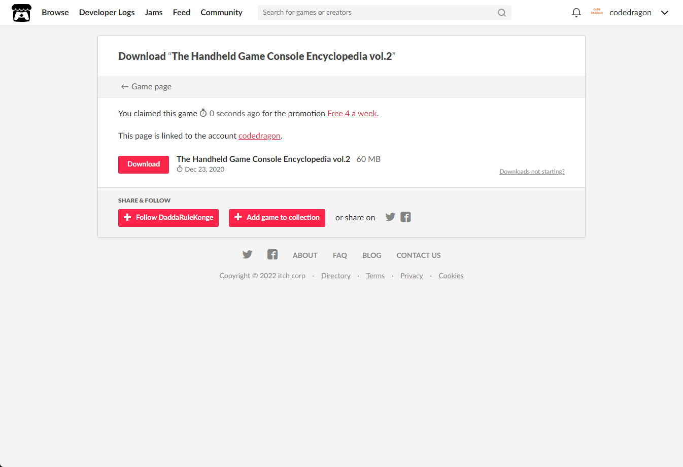 [Claim game]을 클릭하면 "The Handheld Game Console Encyclopedia vol.2" 게임이 나의 게임 라이브러리에 추가되고 설치파일을 다운받을 수 있는 페이지로 이동됩니다.