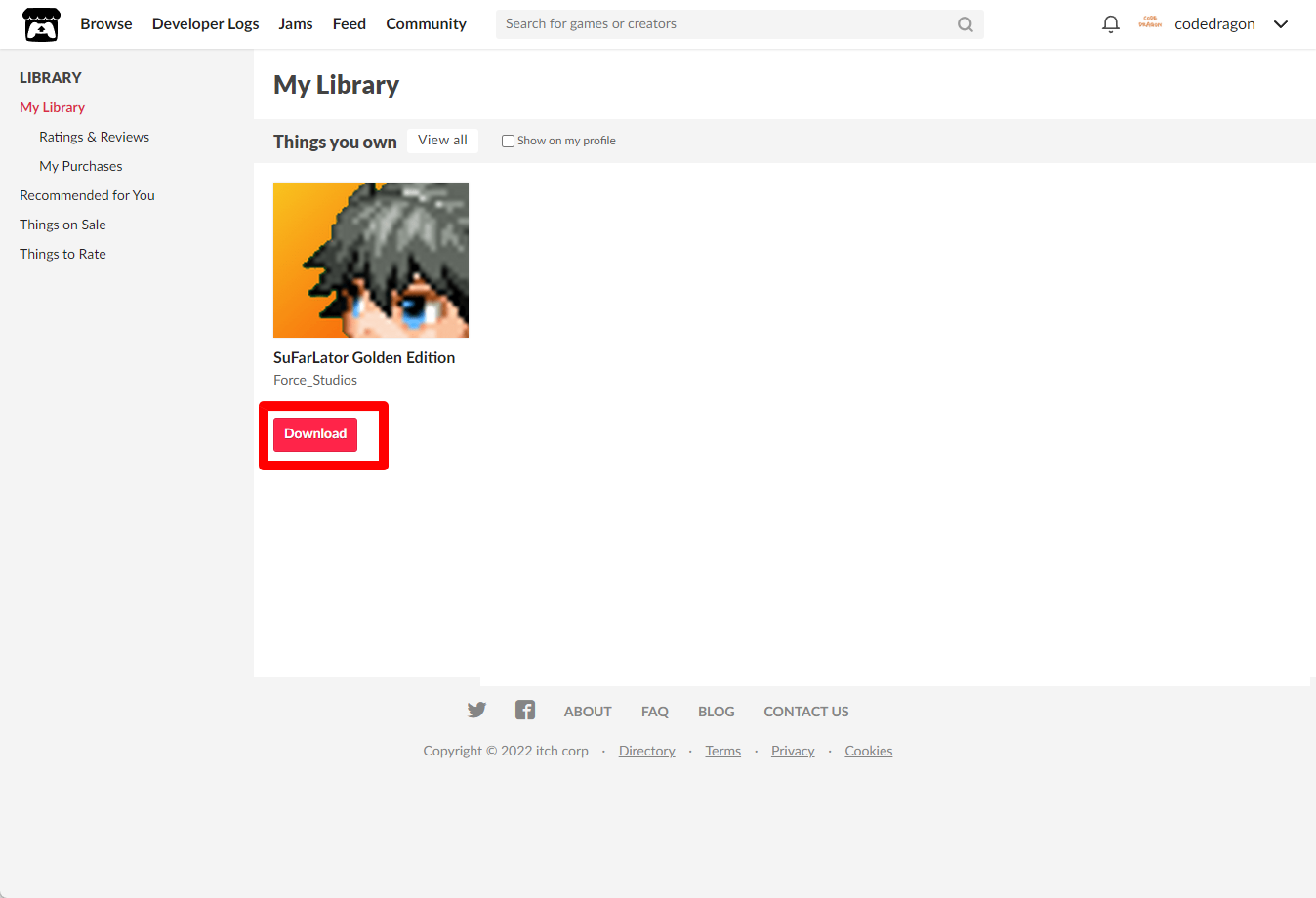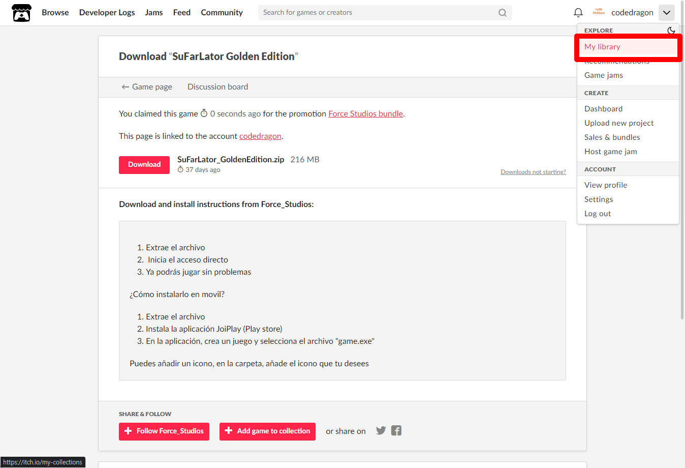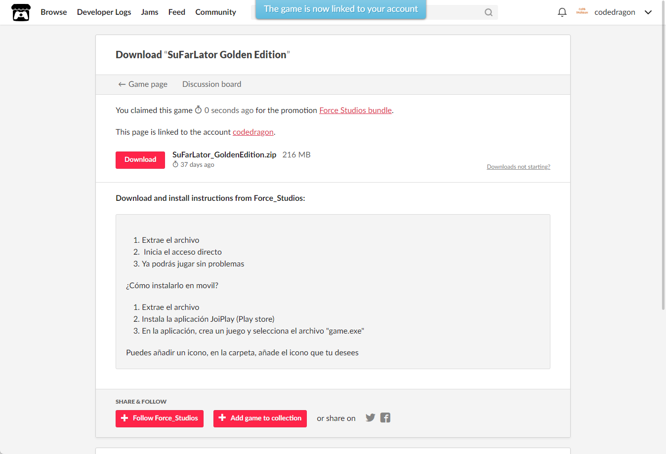 [Claim game]을 클릭하면 "SuFarLator Golden Edition" 게임이 나의 게임 라이브러리에 추가되고 설치파일을 다운받을 수 있는 페이지로 이동됩니다.