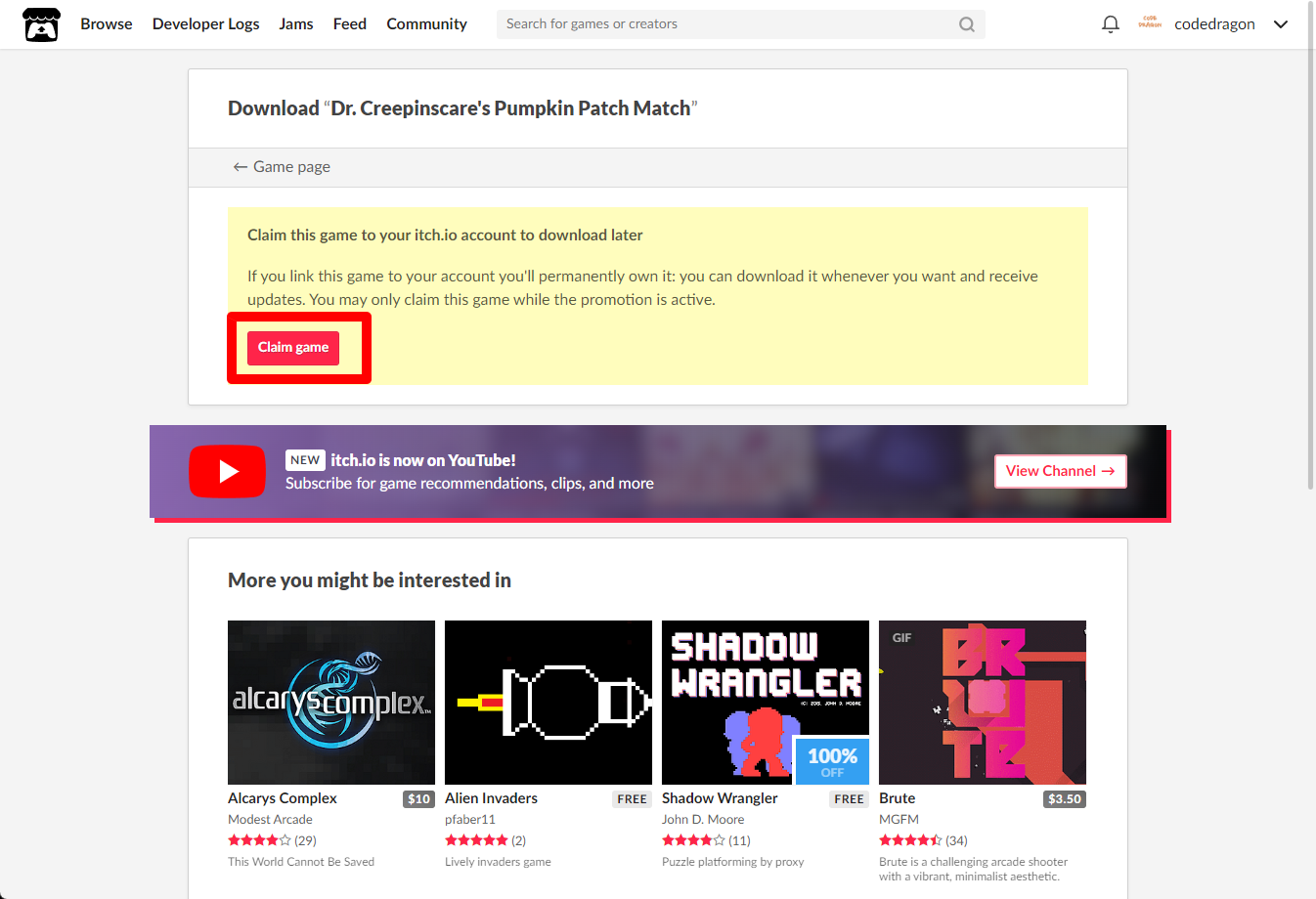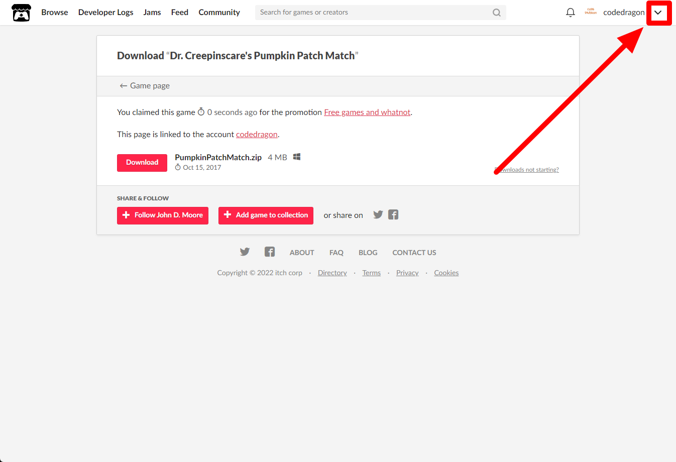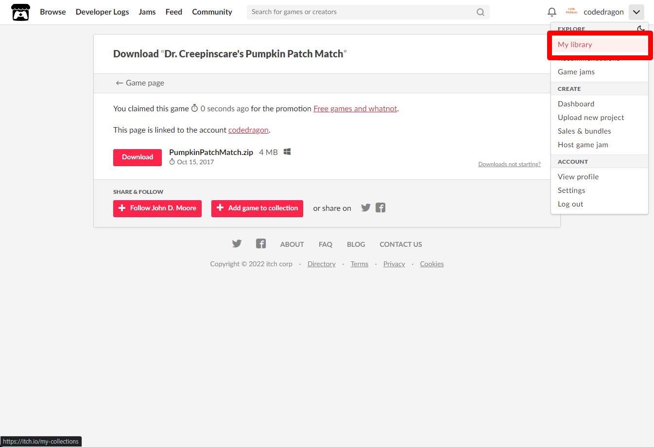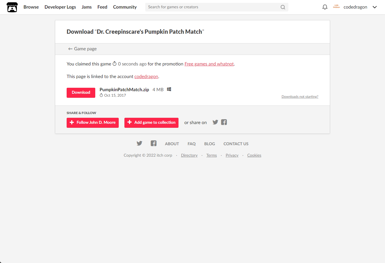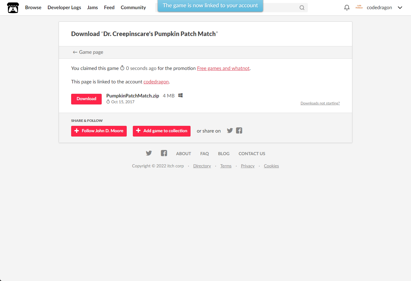 [Claim game]을 클릭하면 "Dr. Creepinscare's Pumpkin Patch Match" 게임이 나의 게임 라이브러리에 추가되고 설치파일을 다운받을 수 있는 페이지로 이동됩니다.