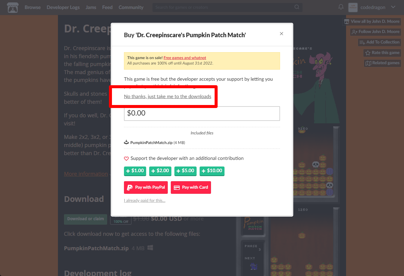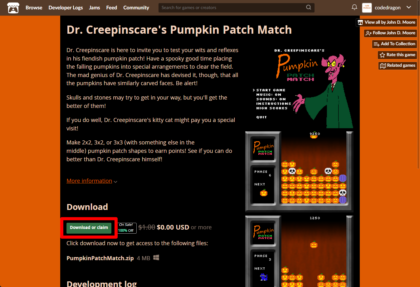 "Dr. Creepinscare's Pumpkin Patch Match" 페이지에 있는 [Download or claim]을 클릭합니다.