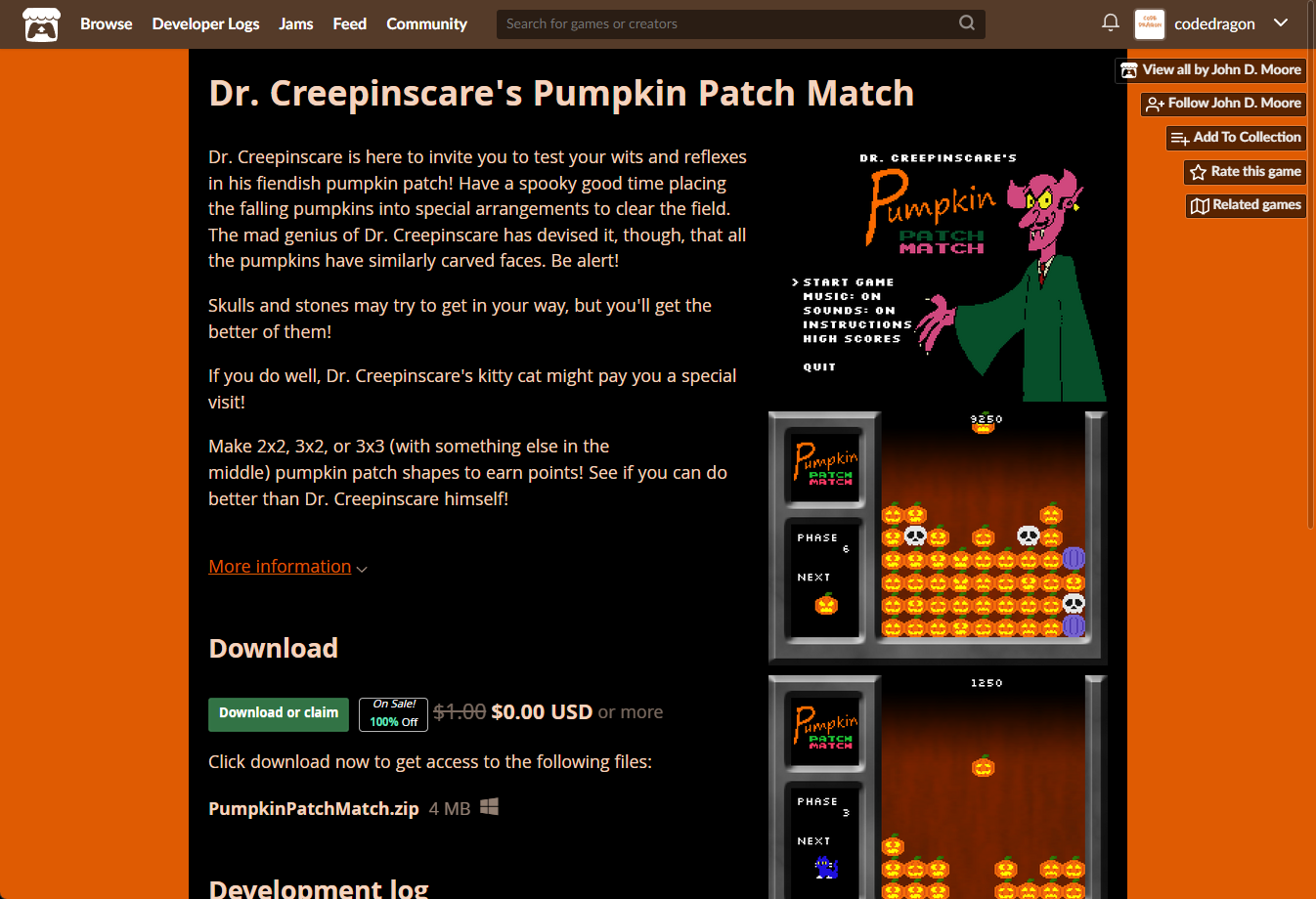 ₩1,310 -> ₩0(Free) Dr. Creepinscare's Pumpkin Patch Match 닥터 크리핀스카르 펌킨 패치 매치 무료로 받기 영구소장 - itch.io 잇치 닷 아이오 한시적 무료 소장하기
