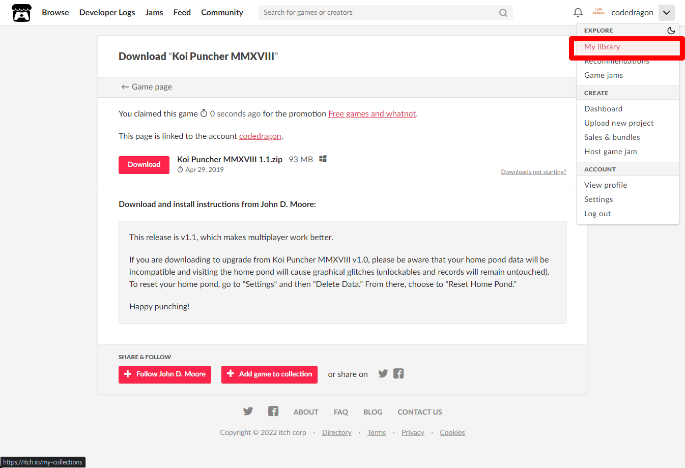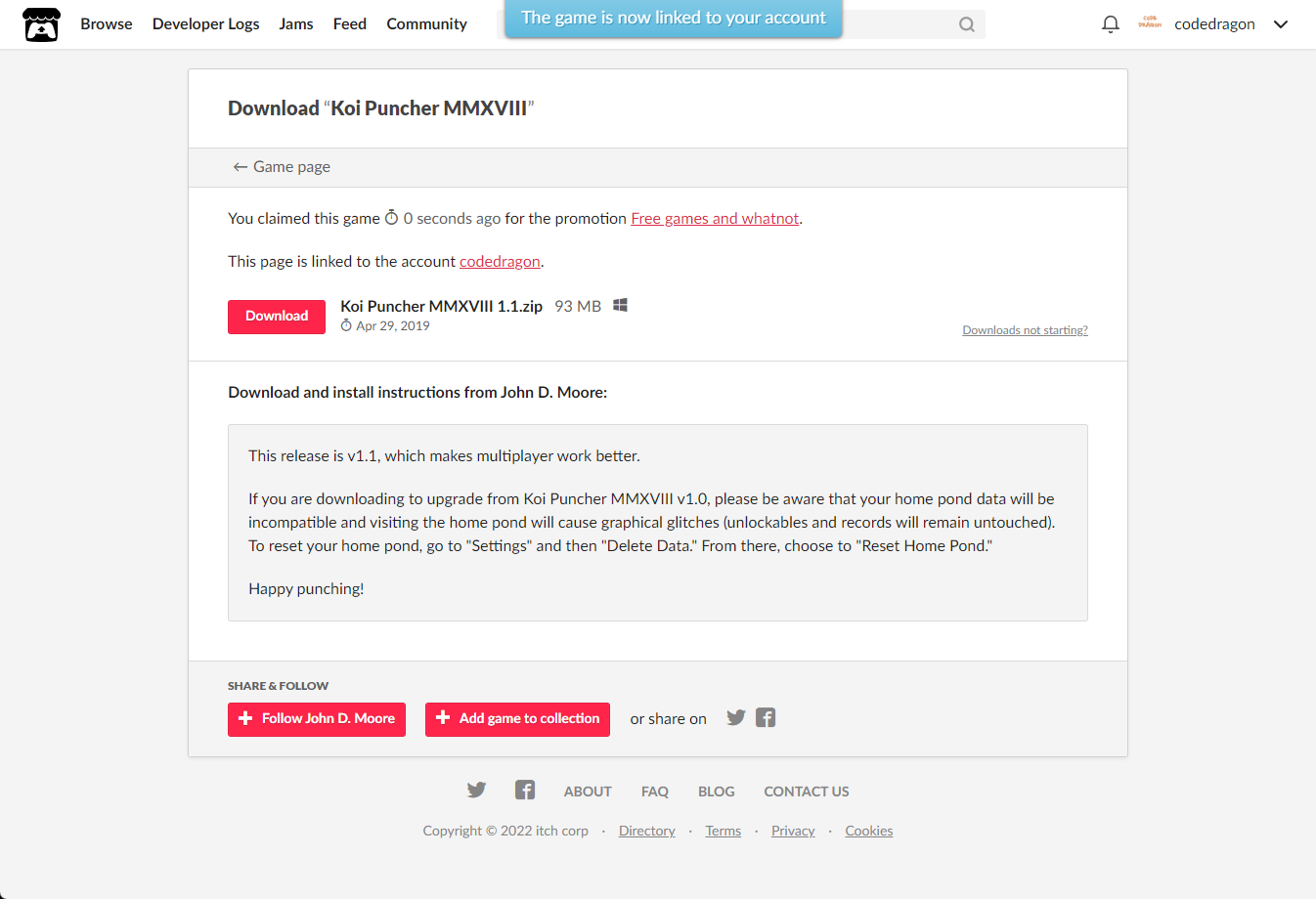 [Claim game]을 클릭하면 "Koi Puncher MMXVIII" 게임이 나의 게임 라이브러리에 추가되고 설치파일을 다운받을 수 있는 페이지로 이동됩니다.