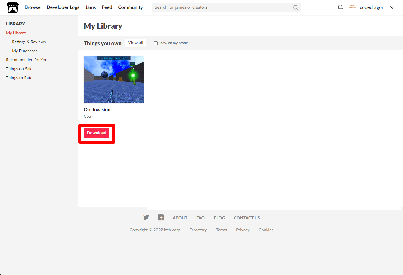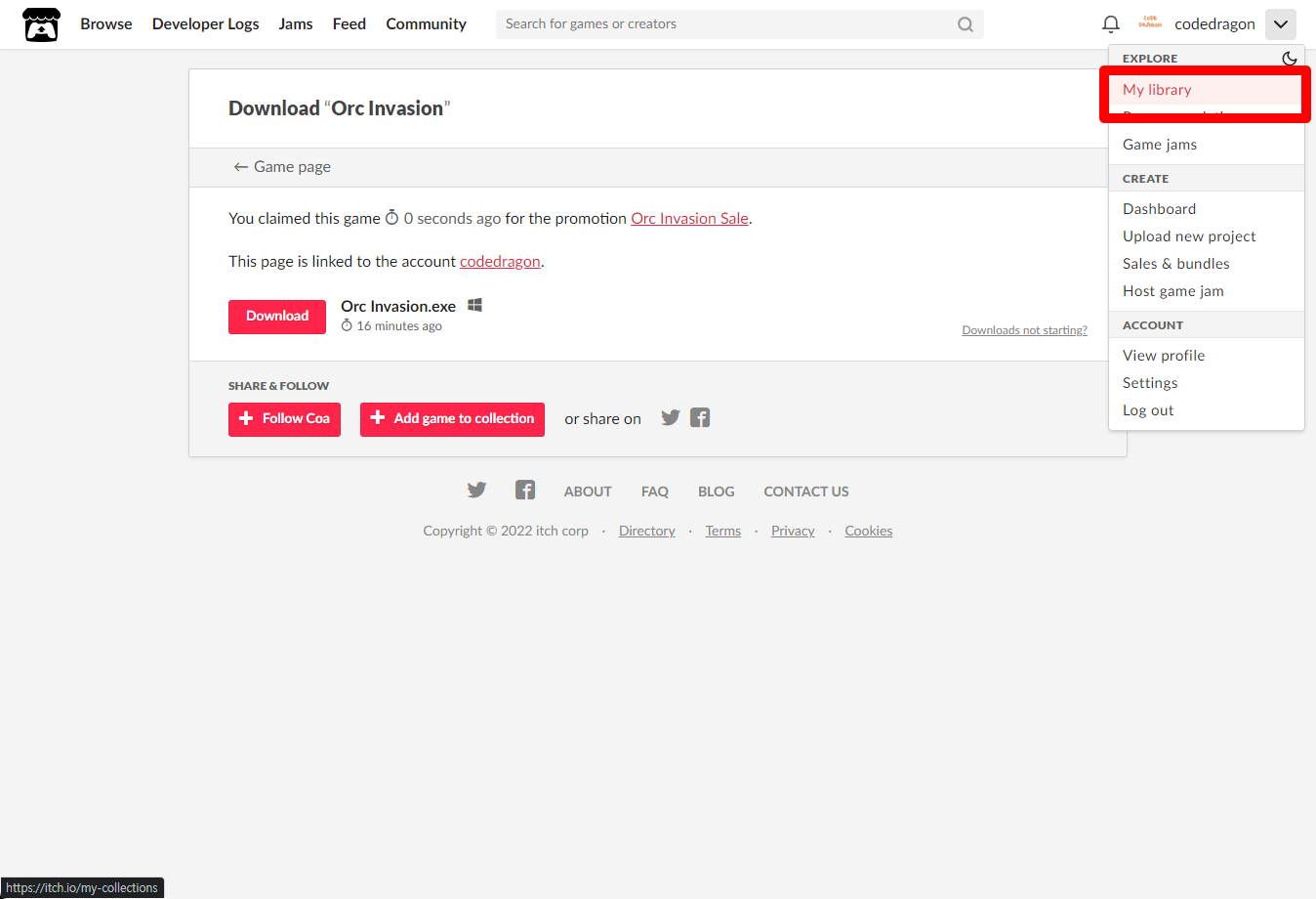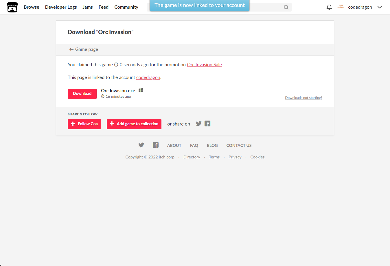 [Claim game]을 클릭하면 "Orc Invasion" 게임이 나의 게임 라이브러리에 추가되고 설치파일을 다운받을 수 있는 페이지로 이동됩니다.